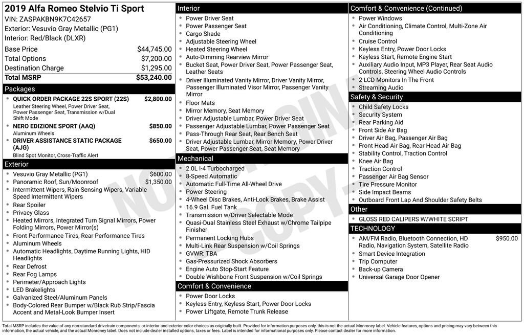 This 2019 Alfa Romeo Stelvio Ti Sport I4 8-Speed Automatic AWD in Vesuvio Gray Metallic comes with the following features: Driver Assistance Static Package (Auto-Dimming Exterior Mirrors and Blind Spot & Cross Path Detection), Nero Edizione Sport (Dark Exhaust Tips, Dark Miron Badging, Dark Miron Exterior Mirror Caps, Dark Miron V Scudetto Grille, Miron Black Rear Valence Panel, Monochromatic Center Wheel Caps, and Wheels: 20 x 8.5 Miron Black Sport Aluminum), Quick Order Package 22S Sport (Aluminum Interior Trim, Aluminum Steering Column Mounted Paddle Shifters, Bright Aluminum Pedals, Colored Brake Calipers, Gloss Black Roof Rails, Gloss Black Window Surround Moldings, Power Adjustable Bolster, Sport Leather Seats, Sport Leather-Wrapped Steering Wheel, Sport Tuned Front Dampers, and Wheels: 20 x 8.5 Sport Aluminum), 3.73 Axle Ratio, 4-Wheel Disc Brakes, 8 Speakers, 8.8 Widescreen Color Display, ABS brakes, Air Conditioning, Alloy wheels, AM/FM radio: SiriusXM, Apple CarPlay/Android Auto, Auto-dimming Rear-View mirror, Automatic temperature control, Brake assist, Bumpers: body-color, Compass, Delay-off headlights, Driver door bin, Driver vanity mirror, Dual front impact airbags, Dual front side impact airbags, Dual-Pane Sunroof, Electronic Stability Control, Four wheel independent suspension, Front anti-roll bar, Front Bucket Seats, Front Center Armrest, Front dual zone A/C, Front reading lights, Fully automatic headlights, Garage door transmitter, Genuine wood console insert, Genuine wood dashboard insert, Genuine wood door panel insert, Gloss Black Shark Fin Antenna, Gloss Red Calipers w/White Script, HD Radio, Heated door mirrors, Heated front seats, Heated steering wheel, High intensity discharge headlights: Bi-Xenon, Illuminated entry, Knee airbag, Leather Seats, Leather Shift Knob, Low tire pressure warning, Memory seat, Occupant sensing airbag, Outside temperature display, Overhead airbag, Overhead console, Panic alarm, ParkView Rear Back-Up Camera, Passenger door bin, Passenger vanity mirror, Power 8-Way Adjustable Driver Seat, Power Adjust 8-Way Front Passenger Seat, Power door mirrors, Power driver seat, Power Liftgate, Power passenger seat, Power steering, Power windows, Radio data system, Radio: AM/FM Bluetooth 8.8, Radio: AM/FM/HD Bluetooth w/Nav 8.8, Rain sensing wipers, Rear anti-roll bar, Rear audio controls, Rear fog lights, Rear reading lights, Rear seat center armrest, Rear window defroster, Rear window wiper, Remote keyless entry, Roof rack: rails only, Security system, Speed control, Speed-sensing steering, Speed-Sensitive Wipers, Split folding rear seat, Spoiler, Sport steering wheel, Steering wheel mounted audio controls, Tachometer, Telescoping steering wheel, Tilt steering wheel, Traction control, Trip computer, Turn signal indicator mirrors, Variably intermittent wipers, and Wheels: 19 x 8.0 Y-Spoke Aluminum.