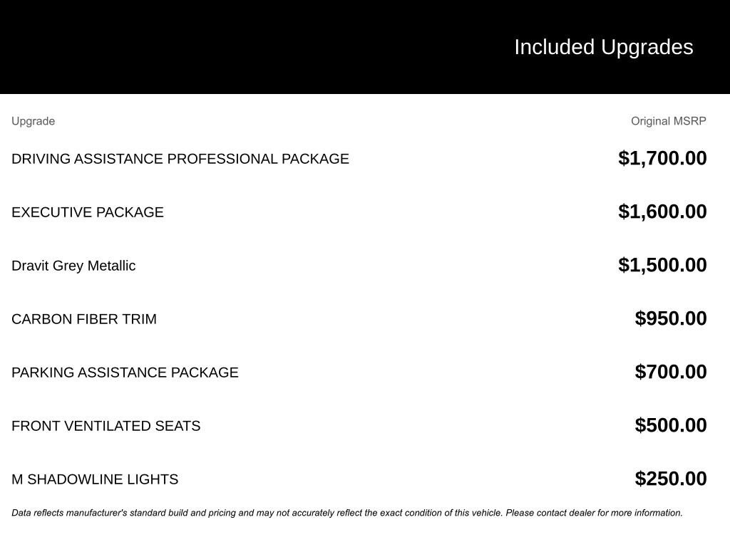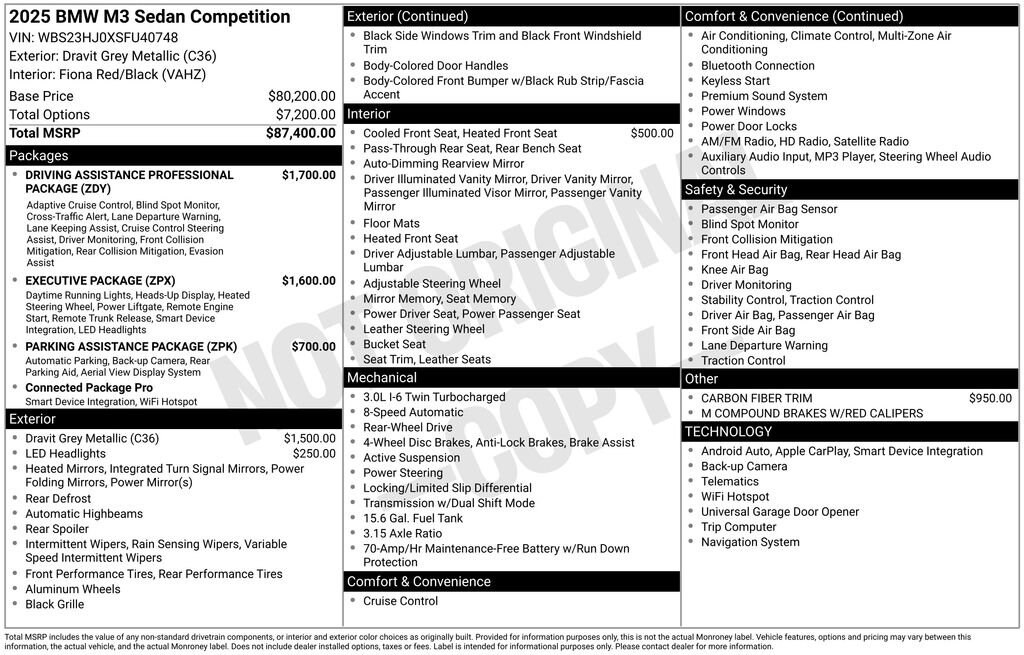 This 2025 BMW M3 Competition 3.0L I6 Turbocharged DOHC 24V LEV3-ULEV70 503hp 8-Speed Automatic Sport RWD in Dravit Gray Metallic comes with the following features: Connected Package Pro, Driving Assistance Professional Package (Active Driving Assistant Pro and Extended Traffic Jam Assistant), Executive Package (BMW Curved Display w/HUD, Full LED Headlights w/Cornering Lights, Heated Steering Wheel, Power Tailgate, and Remote Engine Start), Parking Assistance Package (Parking Assistant Plus), 16 Speakers, 4-Wheel Disc Brakes, ABS brakes, Adaptive suspension, Air Conditioning, Alloy wheels, AM/FM radio: SiriusXM, Apple CarPlay & Android Auto Compatibility, Auto High-beam Headlights, Auto-dimming door mirrors, Auto-dimming Rear-View mirror, Automatic temperature control, BMW Assist eCall, BMW TeleServices, Brake assist, Bumpers: body-color, Carbon Fiber Trim, Compass, ConnectedDrive Services, Delay-off headlights, Driver door bin, Driver vanity mirror, Dual front impact airbags, Dual front side impact airbags, Electronic Stability Control, Emergency communication system: BMW Assist eCall, Extended Merino Leather Upholstery, Exterior Parking Camera Rear, Four wheel independent suspension, Front anti-roll bar, Front Bucket Seats, Front Center Armrest, Front dual zone A/C, Front reading lights, Front Ventilated Seats, Fully automatic headlights, Garage door transmitter, harman/kardon Surround Sound System, harman/kardon® Speakers, Heated door mirrors, Heated Front Seats, Heated front seats, Illuminated entry, Knee airbag, Low tire pressure warning, Lumbar Support, M Compound Brakes w/Red Calipers, M Shadowline Lights, M Sport Seats, Memory seat, Navigation, Navigation System, Occupant sensing airbag, Outside temperature display, Overhead airbag, Panic alarm, Passenger door bin, Passenger vanity mirror, Power door mirrors, Power driver seat, Power Front Seats, Power passenger seat, Power steering, Power windows, Radio data system, Radio: AM/FM Audio System, Rain sensing wipers, Rear air conditioning, Rear anti-roll bar, Rear reading lights, Rear window defroster, Remote keyless entry, Security system, SiriusXM w/360L & 1 Year Platinum Plan Subscription, Speed control, Speed-sensing steering, Speed-Sensitive Wipers, Split folding rear seat, Spoiler, Sport steering wheel, Steering wheel mounted audio controls, Tachometer, Telescoping steering wheel, Tilt steering wheel, Traction control, Trip computer, Turn signal indicator mirrors, Variably intermittent wipers, Wheels: 19x9.5 Fr. & 20x10.5 Rr M Black, Wheels: 19x9.5 Fr.&20x10.5Rr. M Bi-color (1T8), and Wireless Device Charging.