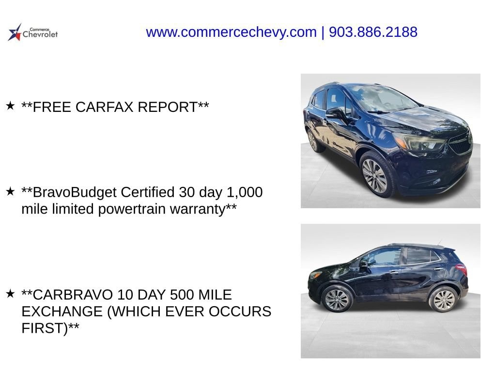Backed by a BravoBudget Certified 30-day, 1,000-mile limited powertrain warranty and a CARBRAVO 10-day, 500-mile exchange policy, this Encore Preferred offers unparalleled peace of mind. Additionally, you'll receive a complimentary CARFAX report, ensuring you have the information you need to make an informed decision.