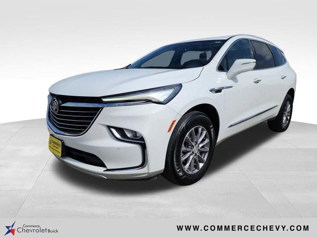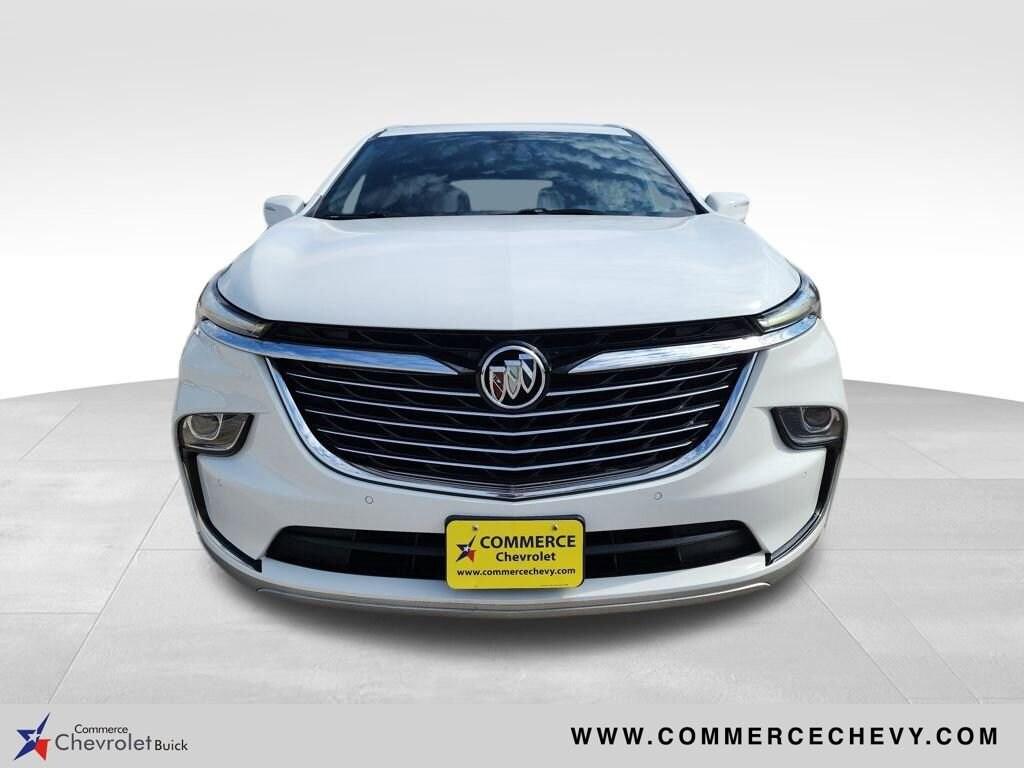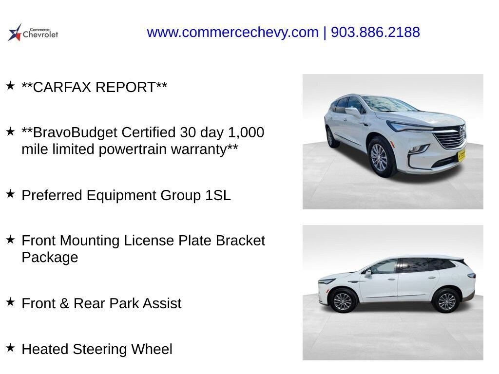 This 2022 Buick Enclave Essence 3.6L V6 SIDI VVT 9-Speed Automatic FWD in Summit White comes with the following features: **CARFAX REPORT** and **BravoBudget Certified 30 day 1,000 mile limited powertrain warranty** Front Mounting License Plate Bracket Package, Preferred Equipment Group 1SL (Front & Rear Park Assist and Heated Steering Wheel), and FWD Front Mounting License Plate Bracket Package, Preferred Equipment Group 1SL (Front & Rear Park Assist and Heated Steering Wheel), FWD, 18 Aluminum Wheels, 3.49 Axle Ratio, 3rd row seats: split-bench, 4-Wheel Disc Brakes, 6 Speakers, 6-Speaker Audio System Feature, 6-Way Power Front Passenger Seat Adjuster, 7-Passenger Seating, 8-Way Power Driver Seat Adjuster, ABS brakes, Air Conditioning, Alloy wheels, AM/FM radio: SiriusXM with 360L, Auto High-beam Headlights, Auto-dimming door mirrors, Auto-dimming Rear-View mirror, Automatic temperature control, Brake assist, Bumpers: body-color, Compass, Delay-off headlights, Driver door bin, Driver vanity mirror, Dual front impact airbags, Dual front side impact airbags, Electronic Stability Control, Emergency communication system: OnStar and Buick connected services capable, Four wheel independent suspension, Front anti-roll bar, Front Bucket Seats, Front Center Armrest, Front dual zone A/C, Front reading lights, Fully automatic headlights, Garage door transmitter, Heated door mirrors, Heated Driver & Front Passenger Seats, Heated front seats, Heated steering wheel, Illuminated entry, Leather steering wheel, Low tire pressure warning, Not Equipped w/Front & Rear Park Assist, Occupant sensing airbag, Outside temperature display, Overhead airbag, Overhead console, Panic alarm, Passenger door bin, Passenger vanity mirror, Perforated Leather-Appointed Seat Trim, Power door mirrors, Power Driver Lumbar Control Seat Adjuster, Power driver seat, Power Liftgate, Power Passenger Lumbar Control Seat Adjuster, Power passenger seat, Power steering, Power windows, Premium audio system: Buick Infotainment System, Radio data system, Radio: Buick Infotainment System AM/FM Stereo, Rear air conditioning, Rear anti-roll bar, Rear reading lights, Rear window defroster, Rear window wiper, Remote keyless entry, Roof rack: rails only, Security system, SiriusXM w/360L, Speed control, Speed-sensing steering, Spoiler, Steering wheel mounted audio controls, Tachometer, Telescoping steering wheel, Tilt steering wheel, Traction control, Trip computer, Turn signal indicator mirrors, Variably intermittent wipers, Voltmeter, and Wireless Apple CarPlay/Wireless Android Auto.