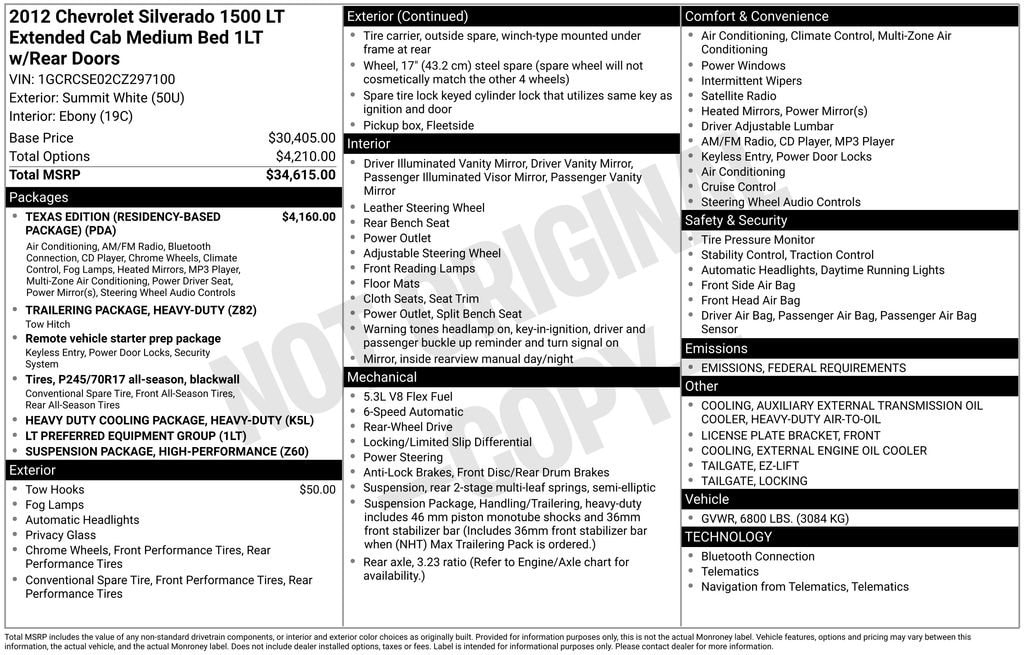 This 2012 Chevrolet Silverado 1500 LT Texas Edition Vortec 5.3L V8 SFI VVT Flex Fuel 6-Speed Automatic Electronic with Overdrive RWD in Summit White comes with the following features: 6-Speed Automatic Electronic with Overdrive and Ebony Cloth Heavy Duty Cooling Package (Heavy-Duty Air-to-Oil External Engine Oil Cooler and Heavy-Duty Auxiliary External Transmission Oil Cooler), Heavy-Duty Handling/Trailering Suspension Package, Heavy-Duty Trailering Package (Heavy-Duty Rear Automatic Locking Differential), Heavy-Duty Trailering Package (Retail), High-Performance Suspension Package, LT1 Equipment Group (6 Speaker Audio System Feature, Body-Colored Bodyside Moldings, Chrome Grille Surround, Color-Keyed Carpeting w/Rubberized Vinyl Floormats, Driver & Front Passenger Illuminated Visor Mirrors, Driver-Side Manual Lumbar Control Seat Adjuster, Heated Power-Adjustable Black Outside Mirrors, Leather-Wrapped Steering Wheel, Power Door Locks w/Remote Keyless Entry, Power Windows w/Driver Express-Down, Rear Access Door Power Windows, and Solar-Ray Deep-Tinted Glass), 6-Speed Automatic Electronic with Overdrive, Ebony Cloth, 17 x 7.5 6-Lug Chrome-Styled Steel Wheels, 6 Speakers, 6-Way Power Driver Seat Adjuster, ABS brakes, Air Conditioning, AM/FM radio: SiriusXM, AM/FM Stereo w/CD Player & MP3 Playback, AM/FM Stereo w/MP3 Compatible CD Player, Bluetooth® For Phone, Bodyside moldings, Bumpers: chrome, CD player, Compass, Delay-off headlights, Driver door bin, Driver vanity mirror, Dual front impact airbags, Dual front side impact airbags, Dual-Zone Automatic Climate Control, Electronic Stability Control, Emergency communication system: OnStar Directions & Connections, EZ-Lift Tailgate, Four 20 x 8.5 Chrome-Clad Aluminum Wheels, Front 40/20/40 Split-Bench Seat, Front anti-roll bar, Front Black Recovery Hooks, Front Center Armrest w/Storage, Front Halogen Fog Lamps, Front License Plate Bracket, Front reading lights, Front wheel independent suspension, Fully automatic headlights, Heated door mirrors, Illuminated entry, Locking Tailgate, Low tire pressure warning, Occupant sensing airbag, Outside temperature display, Overhead airbag, Overhead console, Panic alarm, Passenger door bin, Passenger vanity mirror, Power door mirrors, Power steering, Power windows, Premium Cloth Seat Trim, Radio data system, Rear reading lights, Rear step bumper, Remote keyless entry, Security system, SIRIUSXM Satellite Radio, Speed control, Split folding rear seat, Steering Wheel Mounted Audio Controls, Tachometer, Tilt steering wheel, Traction control, Variably intermittent wipers, and Voltmeter.