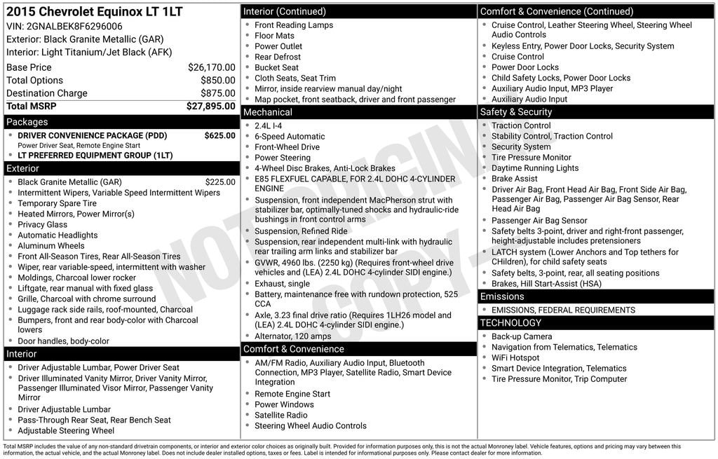 We are a family owned and operated business. We look forward to serving all your automotive needs, sales, service, parts, and body shop. When it comes to your automotive needs, Commerce Chevrolet has you covered. Contact us today! 903-886-2188.This 2015 Chevrolet Equinox LT 1LT 2.4L 4-Cylinder SIDI DOHC VVT 6-Speed Automatic with Overdrive FWD in Black Granite Metallic comes with the following features: Driver Convenience Package (8-Way Power Driver Seat Adjuster and Remote Vehicle Starter System), Equipment Group 1LT (6 Speaker Audio System Feature, Bluetooth® For Phone, and Manual Climate Control), 17 Aluminum Wheels, 3.23 Axle Ratio, 4-Wheel Disc Brakes, 6 Speakers, ABS brakes, Air Conditioning, Alloy wheels, AM/FM radio: SiriusXM, Brake assist, Bumpers: body-color, CD player, Compass, Delay-off headlights, Deluxe Front Bucket Seats, Driver door bin, Driver vanity mirror, Dual front impact airbags, Dual front side impact airbags, E10 Fuel Capable, E85 FlexFuel Capable, Electronic Stability Control, Emergency communication system: OnStar Directions & Connections, Exterior Parking Camera Rear, Four wheel independent suspension, Front anti-roll bar, Front Bucket Seats, Front Center Armrest, Front reading lights, Fully automatic headlights, Heated door mirrors, Illuminated entry, Low tire pressure warning, Occupant sensing airbag, Outside temperature display, Overhead airbag, Panic alarm, Passenger door bin, Passenger vanity mirror, Power door mirrors, Power driver seat, Power steering, Power windows, Premium audio system: Chevrolet MyLink, Premium Cloth Seat Trim, Radio data system, Radio: Chevrolet MyLink Audio System, Rear anti-roll bar, Rear seat center armrest, Rear window defroster, Rear window wiper, Remote keyless entry, Roof rack: rails only, Security system, SiriusXM Satellite Radio, Speed control, Speed-sensing steering, Split folding rear seat, Spoiler, Steering wheel mounted audio controls, Tachometer, Telescoping steering wheel, Tilt steering wheel, Traction control, Trip computer, and Variably intermittent wipers.Awards:* JD Power Initial Quality Study, JD Power Dependability Study * JD Power Initial Quality Study * 2015 IIHS Top Safety Pick * 2015 KBB.com 10 Best Used Family Cars Under $15,000 * 2015 KBB.com 10 Best Used Compact SUVs Under $15,000