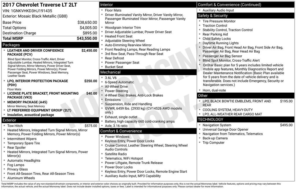 Discover the perfect blend of style, capability, and convenience in this 2017 Chevrolet Traverse 2LT. This versatile SUV is ready to elevate your driving experience with its impressive array of premium features and advanced technologies. Leather and Driver Confidence Package Trailering Equipment Color Touch Navigation System Interior Protection Package (LPO) Front and Rear Black Bowtie Emblems (LPO)Slip into the plush, leather-appointed seating and experience the comfort of 8-way power adjustability for both the driver and front passenger. The memory package ensures your ideal driving position is always at the ready. Stay connected with the Chevrolet MyLink infotainment system, featuring a color touch navigation display and the convenience of SiriusXM Satellite Radio.For added peace of mind, the Traverse 2LT is equipped with the Driver Confidence Package, including Side Blind Zone Alert and Rear Cross Traffic Alert. Tow your gear with confidence thanks to the heavy-duty cooling system and trailer hitch. Enhance your interior with the premium touches of the Interior Protection Package, including all-weather floor mats and a rear cargo mat.This Traverse 2LT delivers exceptional capability, with its powerful 3.6L V6 engine and all-wheel drive system. Enjoy the confidence of responsive handling and the efficiency of 22 MPG on the highway. The spacious interior offers seating for up to 7 passengers, with split-folding third-row seats for versatile cargo-carrying ability.Whether you're embarking on family adventures or tackling your daily commute, this 2017 Chevrolet Traverse 2LT is the perfect companion. Experience the perfect blend of style, technology, and capability that will elevate your driving experience. Visit our showroom today to take this remarkable SUV for a test drive and discover why the Traverse is the perfect choice for your next vehicle.