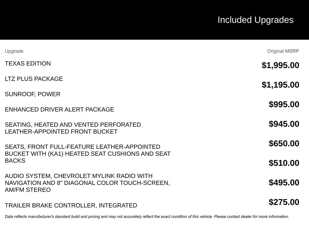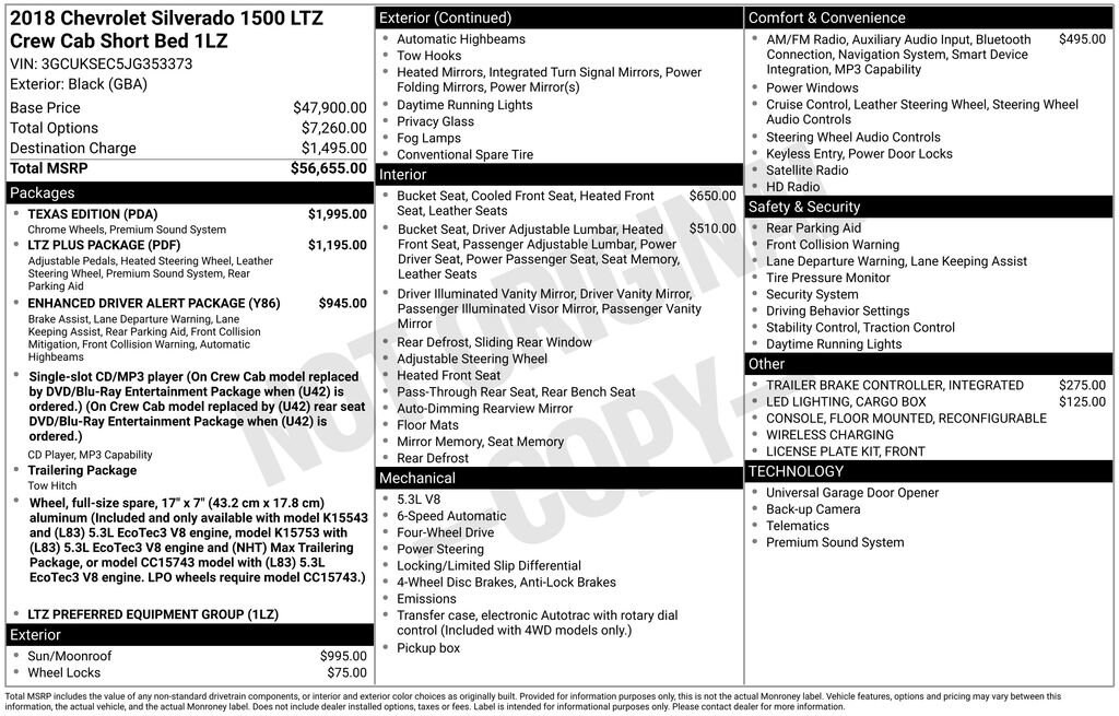 Clean CARFAX. We are a family owned and operated business. We look forward to serving all your automotive needs, sales, service, parts, and body shop. When it comes to your automotive needs, Commerce Chevrolet has you covered. Contact us today! 903-886-2188.This 2018 Chevrolet Silverado 1500 LTZ 1LZ EcoTec3 5.3L V8 6-Speed Automatic Electronic with Overdrive 4WD in Black comes with the following features: 6-Speed Automatic Electronic with Overdrive, 4WD, and Cocoa/Dune Leather Enhanced Driver Alert Package (Forward Collision Alert, IntelliBeam Automatic High Beam On/Off Headlight, Lane Keep Assist, Low Speed Forward Automatic Braking, and Ultrasonic Front & Rear Park Assist), LTZ Plus Package (Leather Wrapped Heated Steering Wheel and Power Adjustable Pedals), Trailering Package, 6-Speed Automatic Electronic with Overdrive, 4WD, Cocoa/Dune Leather, 110-Volt AC Power Outlet, 150 Amp Alternator, 3.42 Rear Axle Ratio, 4-Wheel Disc Brakes, 4.2 Diagonal Color Display Driver Info Center, 40/20/40 Front Split Bench Seat, 6 Speaker Audio System, 6 Speakers, ABS brakes, Air Conditioning, Alloy wheels, AM/FM radio: SiriusXM, Auto-dimming door mirrors, Auto-Dimming Inside Rear-View Mirror, Auto-dimming Rear-View mirror, Automatic temperature control, Auxiliary External Transmission Oil Cooler, Bluetooth® For Phone, Bodyside moldings, Bose Speaker System, Brake assist, CD player, Chevrolet Connected Access, Chevrolet w/4G LTE, Chrome Bodyside Moldings, Chrome Cap Power-Adjustable Heated Outside Mirrors, Chrome Door Handles, Chrome Mirror Caps, Color-Keyed Carpeting w/Rubberized Vinyl Floor Mats, Compass, Deep-Tinted Glass, Delay-off headlights, Driver & Front Passenger Illuminated Vanity Mirrors, Driver door bin, Driver vanity mirror, Dual front impact airbags, Dual front side impact airbags, Dual-Zone Automatic Climate Control, Electric Rear-Window Defogger, Electronic Stability Control, Exterior Parking Camera Rear, EZ Lift & Lower Tailgate, Floor Mounted Console, Front anti-roll bar, Front Center Armrest w/Storage, Front Chrome Bumper, Front dual zone A/C, Front fog lights, Front Frame-Mounted Black Recovery Hooks, Front Full Feature Power Reclining Bucket Seats, Front License Plate Kit, Front reading lights, Front wheel independent suspension, Fully automatic headlights, Garage door transmitter, HD Radio, Heated & Vented Front Seating, Heated door mirrors, Heated Driver & Front Passenger Seats, Heated front seats, Heavy-Duty Rear Locking Differential, Illuminated entry, Integrated Trailer Brake Controller, Leather Appointed Seat Trim, Leather Wrapped Steering Wheel w/Cruise Controls, LED Cargo Box Lighting, LED Taillamps w/Signature, Low tire pressure warning, Manual Tilt/Telescoping Steering Column, Memory seat, Occupant sensing airbag, OnStar & Chevrolet Connected Services Capable, Outside temperature display, Overhead airbag, Overhead console, Panic alarm, Passenger door bin, Passenger vanity mirror, Power door mirrors, Power driver seat, Power passenger seat, Power Sliding Rear Window, Power steering, Power Sunroof, Power windows, Power Windows w/Driver Express Up, Premium audio system: Chevrolet MyLink, Radio data system, Radio: AM/FM 8 Diagonal Clr Touch Nav, Radio: AM/FM 8 Diagonal Color Touch Screen, Rear 60/40 Folding Bench Seat (Folds Up), Rear Chrome Bumper, Rear reading lights, Rear seat center armrest, Rear step bumper, Rear Wheelhouse Liners, Rear window defroster, Remote Keyless Entry, Remote keyless entry, Remote Locking Tailgate, Remote Vehicle Starter System, Security system, Single Slot CD/MP3 Player, SiriusXM Satellite Radio, Speed control, Speed-sensing steering, Split folding rear seat, Spray-On Pickup Box Bed Liner, Steering Wheel Audio Controls, Steering wheel mounted audio controls, Tachometer, Telescoping steering wheel, Theft Deterrent System (Unauthorized Entry), Thin Profile LED Fog Lamps, Tilt steering wheel, Traction control, Trip computer, Turn signal indicator mirrors, Universal Home Remote