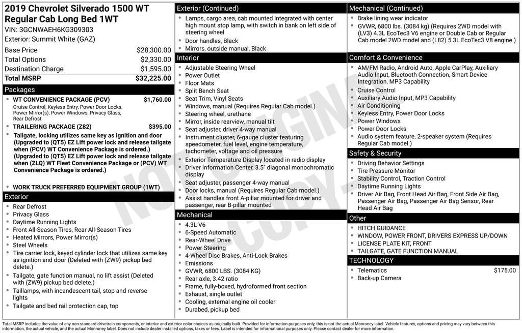 Discover the Exceptional Value of this 2019 Chevrolet Silverado 1500 WTAs a trusted name in the automotive industry, Chevrolet has long been synonymous with quality, reliability, and uncompromising performance. This 2019 Silverado 1500 WT exemplifies these core values, offering an exceptional blend of capability, convenience, and style that is sure to impress discerning buyers.This Silverado boasts an impressive array of features, including:- BravoBudget Certified 30 day 1,000 mile limited powertrain warranty- CARBRAVO 10 DAY 500 MILE EXCHANGE (WHICH EVER OCCURS FIRST)- FREE CARFAX REPORT- WT CONVENIENCE PACKAGE- TRAILERING PACKAGE- ONSTAR AND CHEVROLET CONNECTED SERVICES CAPABLEPowered by the robust EcoTec3 4.3L V6 engine and paired with a smooth-shifting 6-Speed Automatic Electronic transmission, this Silverado delivers a dynamic and efficient driving experience. With its rear-wheel-drive configuration, you'll enjoy confident handling and impressive towing capabilities, making it the perfect companion for your work or recreational needs.Step inside the well-appointed cabin and you'll be greeted by a host of thoughtful features that enhance both comfort and convenience. The WT Convenience Package includes remote keyless entry, EZ Lift power lock and release tailgate, tinted windows, rear-window defogger, cruise control, and power mirrors. The Trailering Package, complete with a trailer hitch and 7-pin and 4-pin connectors, further expands the Silverado's versatility, allowing you to tow with confidence.Chevrolet's commitment to safety is evident in the Silverado's comprehensive suite of advanced driver-assist technologies. Features like the Exterior Parking Camera Rear, ABS brakes, and a suite of airbags work together to provide you and your passengers with a secure and protected driving experience.With its striking white exterior and a well-equipped interior, this 2019 Chevrolet Silverado 1500 WT is a true standout in its class. Boasting impressive fuel efficiency, with an EPA-estimated 16 city and 21 highway MPG, this Silverado offers the perfect blend of capability and efficiency to tackle your daily tasks and weekend adventures.We invite you to experience the exceptional value and uncompromising quality of this 2019 Chevrolet Silverado 1500 WT. Visit our showroom today and let our knowledgeable sales team demonstrate how this remarkable vehicle can exceed your expectations and become an integral part of your lifestyle.