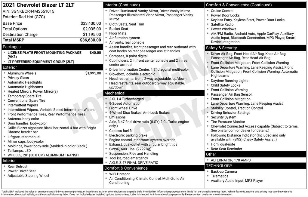 Discover the perfect blend of style, performance, and versatility in the 2021 Chevrolet Blazer LT. This captivating SUV is ready to elevate your driving experience and take you on unforgettable adventures.Boasting a striking Red exterior, the Blazer LT commands attention wherever it goes. Under the hood, you'll find a powerful 2.0L Turbocharged engine paired with a smooth-shifting 9-Speed Automatic transmission, delivering an impressive blend of power and efficiency with 22 city and 29 highway MPG.- LPO, 20 (50.8 CM) GLOSS BLACK ALUMINUM WHEELS- LICENSE PLATE FRONT MOUNTING PACKAGESlip into the premium cloth-trimmed interior and experience the perfect balance of comfort and technology. The Chevrolet Infotainment 3 System with SiriusXM Radio keeps you connected and entertained, while features like Dual-Zone Automatic Climate Control, Power Driver's Seat, and Steering Wheel-Mounted Audio Controls ensure a tailored driving experience.Safety is paramount in the Blazer LT, with a suite of advanced features including Rear Camera, Automatic High Beam Headlights, and a comprehensive airbag system to give you peace of mind on every journey.Elevate your driving experience with the 2021 Chevrolet Blazer LT. This versatile SUV offers the perfect blend of style, performance, and technology, making it the ideal choice for those who demand more from their vehicle. Visit our showroom today and let us demonstrate how the Blazer LT can enhance your life on the road.