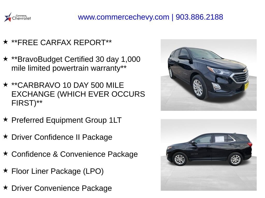 This 2021 Chevrolet Equinox LT 1.5L DOHC 6-Speed Automatic Electronic with Overdrive FWD in Mosaic Black Metallic comes with the following features: **FREE CARFAX REPORT**, **BravoBudget Certified 30 day 1,000 mile limited powertrain warranty**, and **CARBRAVO 10 DAY 500 MILE EXCHANGE (WHICH EVER OCCURS FIRST)** Confidence & Convenience Package, Driver Confidence II Package (Lane Change Alert w/Side Blind Zone Alert, Rear Cross Traffic Alert, and Rear Park Assist w/Audible Warning), Driver Convenience Package, Floor Liner Package (LPO) (All-Weather Floor Liners (LPO) and Integrated Cargo Liner (LPO)), and Preferred Equipment Group 1LT Confidence & Convenience Package, Driver Confidence II Package (Lane Change Alert w/Side Blind Zone Alert, Rear Cross Traffic Alert, and Rear Park Assist w/Audible Warning), Driver Convenience Package (3-Spoke Leather-Wrapped Steering Wheel, Dual Zone Automatic Climate Control, Front Fog Lamps, Heated Driver & Front Passenger Seats, Rear Power Liftgate, Remote Start, and Universal Home Remote), Floor Liner Package (LPO) (All-Weather Floor Liners (LPO) and Integrated Cargo Liner (LPO)), Preferred Equipment Group 1LT, 17 Aluminum Wheels, 2 Rear USB Charging-Only Ports, 2 USB Ports & Auxiliary Input Jack, 2-Way Power Driver Lumbar Control Seat Adjuster, 3.50 Final Drive Axle Ratio, 4-Wheel Disc Brakes, 6 Speaker Audio System Feature, 6 Speakers, 8-Way Power Driver Seat Adjuster, ABS brakes, Air Conditioning, Alloy wheels, AM/FM radio: SiriusXM, Apple CarPlay/Android Auto, Auto High-beam Headlights, Bluetooth® For Phone, Brake assist, Bumpers: body-color, Compass, Delay-off headlights, Driver door bin, Driver vanity mirror, Dual front impact airbags, Dual front side impact airbags, Electronic Stability Control, Emergency communication system: OnStar and Chevrolet connected services capable, Four wheel independent suspension, Front anti-roll bar, Front Bucket Seats, Front Center Armrest, Front Passenger 4-Way Manual Seat Adjuster, Front reading lights, Fully automatic headlights, Heated door mirrors, High-Intensity Discharge Headlights, Illuminated entry, Low tire pressure warning, Occupant sensing airbag, Outside temperature display, Overhead airbag, Overhead console, Panic alarm, Passenger door bin, Passenger vanity mirror, Power door mirrors, Power driver seat, Power steering, Power windows, Premium audio system: Chevrolet Infotainment 3, Premium Cloth Seat Trim, Radio data system, Radio: Chevrolet Infotainment 3 System w/AM/FM, Rear anti-roll bar, Rear reading lights, Rear seat center armrest, Rear window defroster, Rear window wiper, Remote keyless entry, Security system, SiriusXM Radio, Speed control, Speed-sensing steering, Split folding rear seat, Spoiler, Steering wheel mounted audio controls, Tachometer, Telescoping steering wheel, Tilt steering wheel, Traction control, Trip computer, and Variably intermittent wipers.