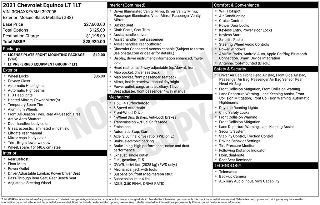 Discover the perfect blend of style, performance, and technology in this 2021 Chevrolet Equinox LT. This sleek and versatile SUV is ready to elevate your driving experience and meet the demands of your active lifestyle. FREE CARFAX REPORT LPO, WHEEL LOCKS Preferred Equipment Group 1LT 6 Speaker Audio System Feature 8-Way Power Driver Seat Adjuster Bluetooth® For Phone Power driver seat Power windows Remote keyless entry Steering wheel mounted audio controls 4-Wheel Disc Brakes ABS brakes Dual front impact airbags Dual front side impact airbags Emergency communication system: OnStar and Chevrolet connected services capable High-Intensity Discharge Headlights Security system Speed control Apple CarPlay/Android Auto Compass Premium Cloth Seat Trim 17 Aluminum WheelsUnder the hood, the Equinox LT boasts a 1.5L DOHC engine paired with a 6-Speed Automatic Electronic transmission, delivering a smooth and efficient driving experience. With an EPA-estimated 26 MPG in the city and 31 MPG on the highway, this SUV strikes the perfect balance between power and fuel economy.The spacious interior of the Equinox LT is designed with your comfort and convenience in mind. Enjoy the premium cloth seats, 8-way power driver's seat, and dual-zone automatic climate control, all while staying connected with the Chevrolet Infotainment 3 system featuring Apple CarPlay and Android Auto integration.Safety is a top priority in the Equinox LT, with a suite of advanced driver-assistance features, including OnStar and Chevrolet connected services, dual front and side impact airbags, and a comprehensive electronic stability control system.Whether you're commuting to work, embarking on a family road trip, or tackling your weekend adventures, this 2021 Chevrolet Equinox LT is the perfect companion. Experience the perfect blend of style, performance, and technology that will elevate your driving experience. Schedule a test drive today and discover why the Equinox LT is the smart choice for your next SUV.