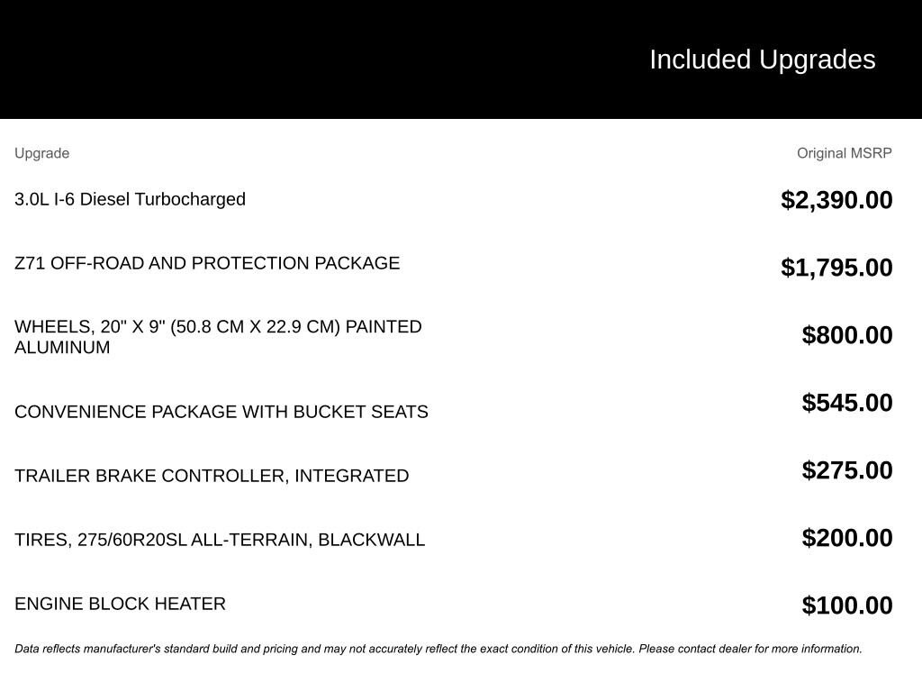 - Engine : Duramax 3L I-6 diesel direct injection, DOHC, variable valve control, intercooled turbo, diesel, engine with 277HP