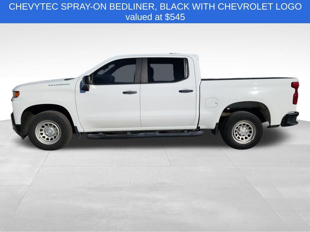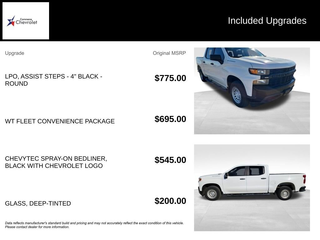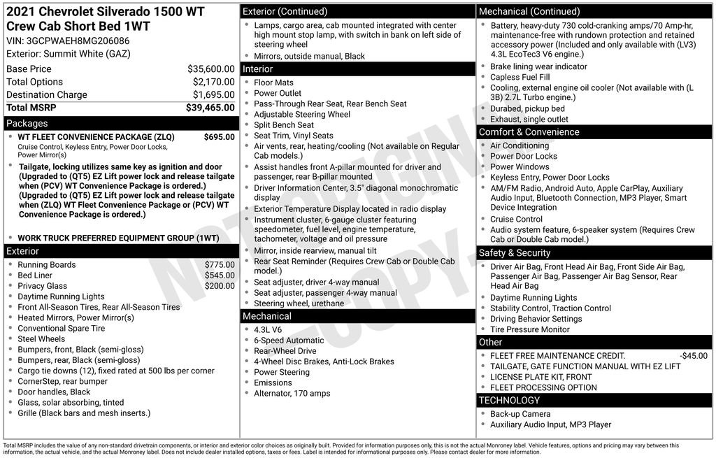 This 2021 Chevrolet Silverado 1500 WT EcoTec3 4.3L V6 6-Speed Automatic Electronic with Overdrive RWD in Summit White comes with the following features: 6-Speed Automatic Electronic with Overdrive and Jet Black Vinyl Preferred Equipment Group 1WT (170 Amp Alternator, 3.5 Diagonal Monochromatic Display, Black (Semi-Gloss) Front Bumper, Black (Semi-Gloss) Rear Bumper, Black Grille, Black Manual Outside Mirrors, Bluetooth® For Phone, Locking Tailgate, Manual Tilt Wheel Steering Column, Power Door Locks, Power Rear Windows w/Express Down, Rear 60/40 Folding Bench Seat (Folds Up), Rubberized-Vinyl Floor Covering, Solar Absorbing Tinted Glass, and Standard Tailgate), 6-Speed Automatic Electronic with Overdrive, Jet Black Vinyl, 3.42 Rear Axle Ratio, 4-Wheel Disc Brakes, 4 Black Round Assist Steps (LPO) (DISC), 40/20/40 Front Split Bench Seat, 6 Speakers, ABS brakes, Air Conditioning, AM/FM radio, Apple CarPlay/Android Auto, Brake assist, Chevytec Spray-On Black Bedliner, Deep-Tinted Glass, Delay-off headlights, Driver door bin, Dual front impact airbags, Dual front side impact airbags, Electronic Cruise Control, Electronic Stability Control, EZ Lift Power Lock & Release Tailgate, Front anti-roll bar, Front Center Armrest w/Storage, Front License Plate Kit, Front reading lights, Front wheel independent suspension, Fully automatic headlights, Heated Power-Adjustable Outside Mirrors, Heavy Duty Suspension, Low tire pressure warning, Occupant sensing airbag, Outside temperature display, Overhead airbag, Overhead console, Passenger door bin, Passenger vanity mirror, Power steering, Power windows, Premium audio system: Chevrolet Infotainment 3, Radio data system, Radio: Chevrolet Infotainment 3 System, Rear reading lights, Rear step bumper, Remote Keyless Entry, Speed-sensing steering, Split folding rear seat, Tachometer, Tilt steering wheel, Traction control, Trip computer, Variably intermittent wipers, Vinyl Seat Trim, Voltmeter, and Wheels: 17 x 8 Ultra Silver Painted Steel.