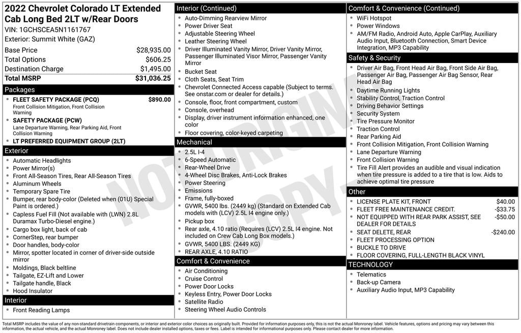 Discover the perfect blend of capability, technology, and style in this 2022 Chevrolet Colorado LT. With its impressive 2.5L I4 engine, this Colorado delivers a dynamic driving experience while maintaining exceptional fuel efficiency, achieving up to 25 MPG on the highway. Boasting a sleek white exterior, this Colorado is not only visually stunning but also packed with a host of advanced features to enhance your driving experience.