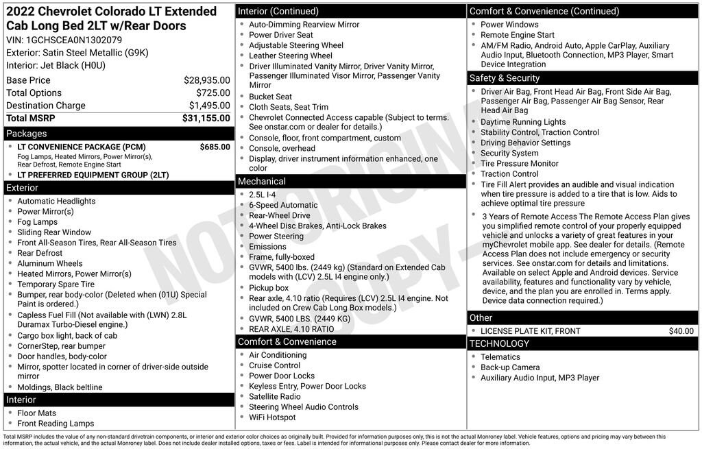 Discover the perfect blend of capability and comfort in the 2022 Chevrolet Colorado LT. This rugged and versatile pickup is ready to take on your adventures, whether it's hauling heavy loads or navigating the open road with ease.Equipped with a range of premium features, the Colorado LT offers unparalleled value and convenience. Highlights include:- FREE CARFAX REPORT- BravoBudget Certified 30 day 1,000 mile limited powertrain warranty- CARBRAVO 10 DAY 500 MILE EXCHANGE (WHICH EVER OCCURS FIRST)- LT Convenience Package with rear-sliding window, front fog lamps, and more- Remote vehicle starter system for added comfort and convenienceUnder the hood, the Colorado LT boasts a 2.5L I4 DI DOHC VVT engine, paired with a smooth-shifting 6-speed automatic transmission and rear-wheel drive. This powertrain delivers a confident and responsive driving experience, while also achieving an impressive 19 MPG in the city and 25 MPG on the highway.Step inside the Colorado LT and you'll be greeted by a well-appointed interior, featuring premium cloth seating, a 6-speaker audio system, and the Chevrolet Infotainment 3 system with Apple CarPlay and Android Auto integration. Stay connected and entertained on the go, while also enjoying the convenience of power windows, power door locks, and a remote keyless entry system.Safety is also a top priority in the Colorado LT, with features like dual front impact airbags, dual front side impact airbags, and electronic stability control to help keep you and your passengers secure. The rear vision camera and rear parking sensors also make it easier to maneuver in tight spaces.Whether you're tackling tough jobs or seeking a versatile companion for your active lifestyle, the 2022 Chevrolet Colorado LT is the perfect choice. Visit our showroom today and experience the power, capability, and comfort of this exceptional pickup truck.