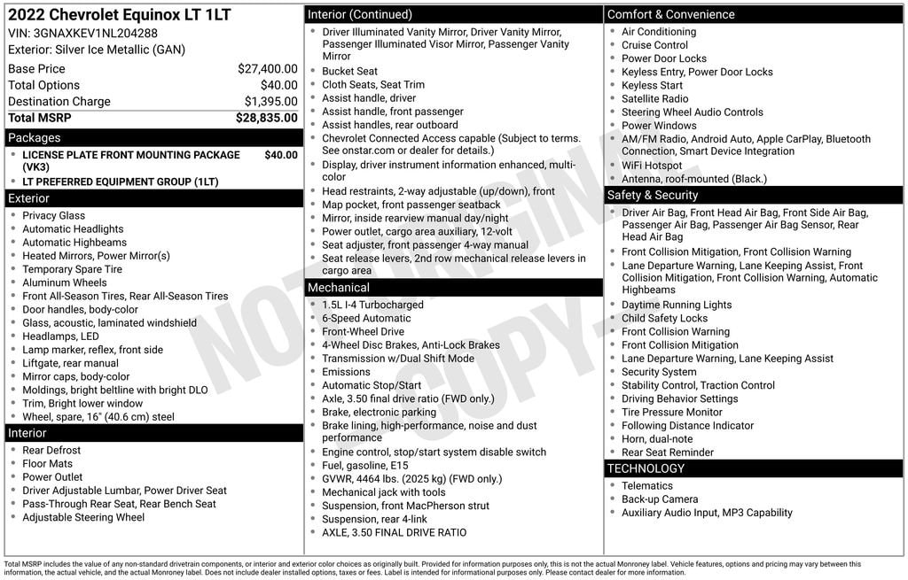 This 2022 Chevrolet Equinox LT 1.5L DOHC 6-Speed Automatic Electronic with Overdrive FWD in Silver Ice Metallic comes with the following features: Preferred Equipment Group 1LT, 17 Aluminum Wheels, 2 Rear USB Charging-Only Ports, 2 USB Ports & Auxiliary Input Jack, 2-Way Power Driver Lumbar Control Seat Adjuster, 3.50 Final Drive Axle Ratio, 4-Wheel Disc Brakes, 6 Speaker Audio System Feature, 6 Speakers, 8-Way Power Driver Seat Adjuster, ABS brakes, Air Conditioning, Alloy wheels, AM/FM radio: SiriusXM, Auto High-beam Headlights, Bluetooth® For Phone, Brake assist, Bumpers: body-color, Compass, Delay-off headlights, Driver door bin, Driver vanity mirror, Dual front impact airbags, Dual front side impact airbags, Electronic Stability Control, Emergency communication system: OnStar and Chevrolet connected services capable, Four wheel independent suspension, Front anti-roll bar, Front Bucket Seats, Front Center Armrest, Front Passenger 4-Way Manual Seat Adjuster, Front reading lights, Fully automatic headlights, Heated door mirrors, Illuminated entry, Low tire pressure warning, Occupant sensing airbag, Outside temperature display, Overhead airbag, Overhead console, Panic alarm, Passenger door bin, Passenger vanity mirror, Power door mirrors, Power driver seat, Power steering, Power windows, Premium audio system: Chevrolet Infotainment 3, Premium Cloth Seat Trim, Radio data system, Radio: Chevrolet Infotainment 3 System w/AM/FM, Rear anti-roll bar, Rear reading lights, Rear seat center armrest, Rear window defroster, Rear window wiper, Remote keyless entry, Security system, SiriusXM Radio, Speed control, Speed-sensing steering, Split folding rear seat, Spoiler, Steering wheel mounted audio controls, Tachometer, Telescoping steering wheel, Tilt steering wheel, Traction control, Trip computer, Variably intermittent wipers, and Wireless Apple CarPlay/Wireless Android Auto.