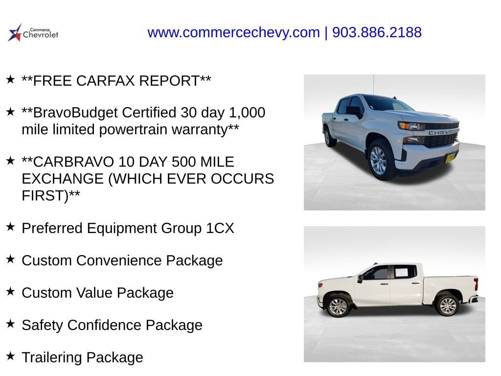 This 2022 Chevrolet Silverado 1500 LTD Custom 2.7L Turbo 8-Speed Automatic RWD in Summit White comes with the following features: **FREE CARFAX REPORT**, **BravoBudget Certified 30 day 1,000 mile limited powertrain warranty**, and **CARBRAVO 10 DAY 500 MILE EXCHANGE (WHICH EVER OCCURS FIRST)** Custom Convenience Package (Electric Rear-Window Defogger, EZ Lift Power Lock & Release Tailgate, LED Cargo Area Lighting, and Remote Vehicle Starter System), Custom Value Package, Infotainment Package, Preferred Equipment Group 1CX (3.5 Monochromatic Display Driver Info Center, Bluetooth® For Phone, Body Color Grille, Color-Keyed Carpeting Floor Covering, Compass, Deep-Tinted Glass, Electronic Cruise Control, Front Rubberized Vinyl Floor Mats, Manual Tilt Wheel Steering Column, Power Door Locks, Power Front Windows w/Driver Express Up/Down, Power Front Windows w/Passenger Express Down, Power Rear Windows w/Express Down, Rear 60/40 Folding Bench Seat (Folds Up), Rear Rubberized-Vinyl Floor Mats, Remote Keyless Entry, and Standard Tailgate), Safety Confidence Package (4.2 Diagonal Color Display Driver Info Center, Automatic Emergency Braking, Forward Collision Alert, Front Pedestrian Braking, and Steering Wheel Audio Controls), and Trailering Package Custom Convenience Package (Electric Rear-Window Defogger, EZ Lift Power Lock & Release Tailgate, LED Cargo Area Lighting, Remote Vehicle Starter System, and Theft Deterrent System (Unauthorized Entry)), Custom Value Package, Infotainment Package (Chevrolet Connected Access Capable, OnStar & Chevrolet Connected Services Capable, SiriusXM Radio, and Wi-Fi Hot Spot Capable), Preferred Equipment Group 1CX (3.5 Monochromatic Display Driver Info Center, Bluetooth® For Phone, Body Color Grille, Color-Keyed Carpeting Floor Covering, Compass, Deep-Tinted Glass, Electronic Cruise Control, Front Rubberized Vinyl Floor Mats, Manual Tilt Wheel Steering Column, Power Door Locks, Power Front Windows w/Driver Express Up/Down, Power Front Windows w/Passenger Express Down, Power Rear Windows w/Express Down, Rear 60/40 Folding Bench Seat (Folds Up), Rear Rubberized-Vinyl Floor Mats, Remote Keyless Entry, and Standard Tailgate), Safety Confidence Package (4.2 Diagonal Color Display Driver Info Center, Automatic Emergency Braking, Forward Collision Alert, Front Pedestrian Braking, and Steering Wheel Audio Controls), Trailering Package (Hitch Guidance), 10-Way Power Driver Seat w/Lumbar, 120-Volt Bed Mounted Power Outlet, 120-Volt Instrument Panel Power Outlet, 3.42 Rear Axle Ratio, 4-Wheel Disc Brakes, 40/20/40 Front Split Bench Seat, 6 Speakers, 6-Speaker Audio System, ABS brakes, Air Conditioning, Alloy wheels, AM/FM radio: SiriusXM, Apple CarPlay/Android Auto, Brake assist, Bumpers: body-color, Chevytec Spray-On Black Bedliner, Cloth Seat Trim, Delay-off headlights, Driver door bin, Driver vanity mirror, Dual front impact airbags, Dual front side impact airbags, Electronic Stability Control, Front anti-roll bar, Front Center Armrest w/Storage, Front License Plate Kit, Front reading lights, Front wheel independent suspension, Fully automatic headlights, Heated door mirrors, Heavy Duty Suspension, Illuminated entry, Low tire pressure warning, Occupant sensing airbag, Outside temperature display, Overhead airbag, Overhead console, Panic alarm, Passenger door bin, Passenger vanity mirror, Power door mirrors, Power steering, Power windows, Premium audio system: Chevrolet Infotainment 3, Radio data system, Radio: Chevrolet Infotainment 3 System, Rear reading lights, Rear step bumper, Rear window defroster, Remote keyless entry, Security system, Speed control, Speed-sensing steering, Spli