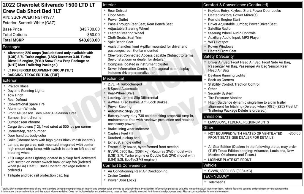 We are a family owned and operated business. We look forward to serving all your automotive needs, sales, service, parts, and body shop. When it comes to your automotive needs, Commerce Chevrolet has you covered. Contact us today! 903-886-2188.This 2022 Chevrolet Silverado 1500 LTD LT 2.7L Turbo 8-Speed Automatic RWD in Summit White comes with the following features: Convenience Package (10-Way Power Driver Seat w/Lumbar, 12-Volt Rear Auxiliary Power Outlet, Dual-Zone Automatic Climate Control, Electric Rear-Window Defogger, Keyless Open & Start, Leather Wrapped Steering Wheel, LED Cargo Area Lighting, Manual Tilt/Telescoping Steering Column, Rear Dual USB Charging-Only Ports, Remote Vehicle Starter System, and Theft Deterrent System (Unauthorized Entry)), Preferred Equipment Group 1LT (2 USB Ports (First Row), 4.2 Diagonal Color Display Driver Info Center, All-Star Edition, Auto-Locking Rear Differential, Bluetooth® For Phone, Chevrolet Connected Access Capable, Chrome Grille, Chrome Mirror Caps, Color-Keyed Carpeting Floor Covering, Compass, Deep-Tinted Glass, Electronic Cruise Control, EZ Lift Power Lock & Release Tailgate, Front Rubberized Vinyl Floor Mats, Heated Driver & Front Outboard Passenger Seats, Heated Steering Wheel, OnStar & Chevrolet Connected Services Capable, Power Door Locks, Power Front Windows w/Driver Express Up/Down, Power Front Windows w/Passenger Express Down, Power Rear Windows w/Express Down, Rear 60/40 Folding Bench Seat (Folds Up), Rear Rubberized-Vinyl Floor Mats, Rear Vision Camera, Standard Tailgate, Steering Wheel Audio Controls, and Wi-Fi Hot Spot Capable), Trailering Package (Hitch Guidance), 220 Amp Alternator, 3.42 Rear Axle Ratio, 4-Wheel Disc Brakes, 40/20/40 Front Split-Bench Seat, 6 Speakers, 6-Speaker Audio System, ABS brakes, Air Conditioning, Alloy wheels, AM/FM radio: SiriusXM, Apple CarPlay/Android Auto, Automatic temperature control, Brake assist, Bumpers: chrome, Cloth Seat Trim, Delay-off headlights, Driver door bin, Driver vanity mirror, Dual front impact airbags, Dual front side impact airbags, Electronic Stability Control, Front anti-roll bar, Front Center Armrest w/Storage, Front dual zone A/C, Front License Plate Kit, Front reading lights, Front wheel independent suspension, Fully automatic headlights, Heated door mirrors, Heated front seats, Heated steering wheel, Heavy Duty Suspension, Illuminated entry, Low tire pressure warning, Not Equipped w/Heated/Ventilated Front Seats, Occupant sensing airbag, Outside temperature display, Overhead airbag, Overhead console, Panic alarm, Passenger door bin, Passenger vanity mirror, Power door mirrors, Power driver seat, Power steering, Power windows, Premium audio system: Chevrolet Infotainment 3, Radio data system, Radio: Chevrolet Infotainment 3 System, Rear reading lights, Rear step bumper, Rear window defroster, Remote keyless entry, Security system, SiriusXM Radio, Speed control, Speed-sensing steering, Split folding rear seat, Steering wheel mounted audio controls, Tachometer, Telescoping steering wheel, Texas Edition Badging, Tilt steering wheel, Traction control, Trip computer, Variably intermittent wipers, Voltmeter, and Wheels: 17 x 8 Bright Silver Painted Aluminum.