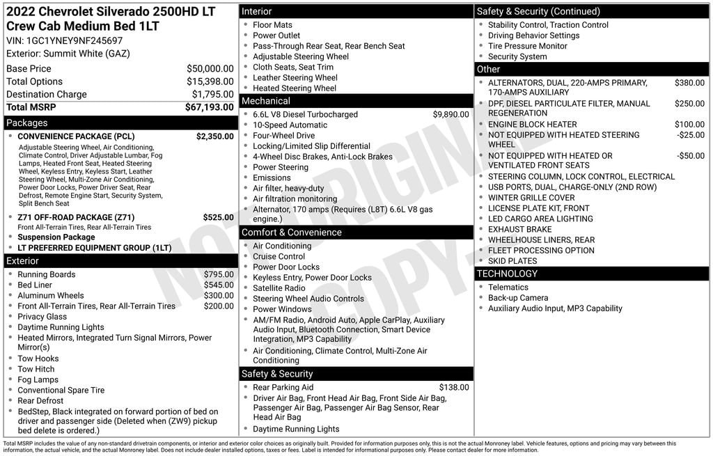 This Silverado 2500HD LT is built to handle the toughest jobs with ease. The Duramax diesel engine provides exceptional towing and hauling capabilities, while the advanced 4WD system ensures you can tackle any terrain. The Convenience Package adds a host of premium features, including dual-zone climate control, heated seats and steering wheel, and a 10-way power driver's seat for unparalleled comfort.