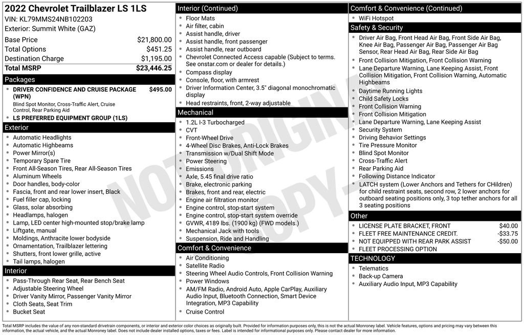 Discover the perfect balance of style, technology, and capability with the 2022 Chevrolet TrailBlazer LS. This versatile SUV is ready to elevate your driving experience and take you on extraordinary adventures.Backed by our BravoBudget Certified warranty and CARBRAVO exchange program, this TrailBlazer LS offers unparalleled peace of mind. Enjoy the added confidence of features like:- BravoBudget Certified 30 day 1,000 mile limited powertrain warranty- CARBRAVO 10 DAY 500 MILE EXCHANGE (WHICH EVER OCCURS FIRST)- FREE CARFAX REPORT- Driver Confidence and Cruise Package with Lane Change Alert, Rear Cross Traffic Alert, and Rear Park Assist- Wireless Apple CarPlay/Android AutoUnder the hood, the 1.2L Ecotec Turbo DOHC DI engine with VVT and CVT transmission deliver an impressive 29 city / 31 highway MPG, ensuring you can tackle your daily commute and weekend getaways with ease.The exterior of this TrailBlazer LS exudes a bold, modern style with its White paint and sleek lines. Step inside the cabin and you'll be greeted by a well-appointed interior, featuring cloth seating, a 6-speaker audio system, and a host of convenient technologies to keep you connected and entertained.Safety is paramount, and this TrailBlazer LS is equipped with a comprehensive suite of advanced safety features, including dual front and side impact airbags, electronic stability control, and a rear-view camera to help you navigate with confidence.Whether you're seeking a practical daily driver or a versatile companion for your weekend adventures, the 2022 Chevrolet TrailBlazer LS is the perfect choice. Experience the perfect blend of style, technology, and capability today. Schedule a test drive and let us show you why this SUV is the ideal addition to your lifestyle.