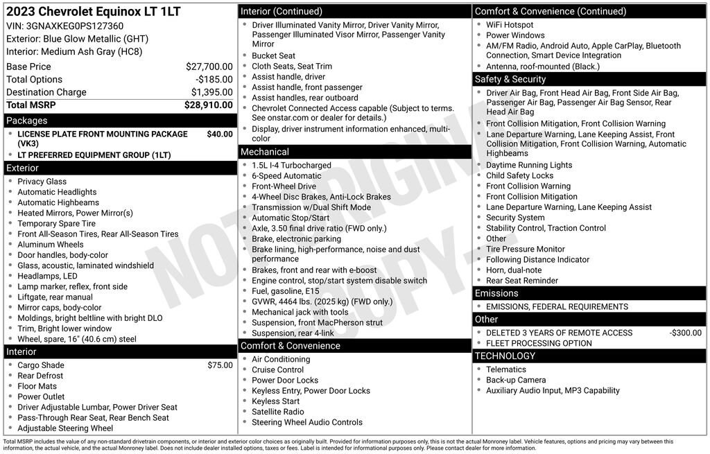 This 2023 Chevrolet Equinox LT 1.5L DOHC 6-Speed Automatic Electronic with Overdrive FWD in Blue Glow Metallic comes with the following features: Preferred Equipment Group 1LT, 17 Aluminum Wheels, 2 Rear USB Charging-Only Ports, 2 USB Ports & Auxiliary Input Jack, 2-Way Power Driver Lumbar Control Seat Adjuster, 3.50 Final Drive Axle Ratio, 4-Wheel Disc Brakes, 6 Speakers, 6-Speaker Audio System Feature, ABS brakes, Air Conditioning, Alloy wheels, AM/FM radio: SiriusXM, Auto High-beam Headlights, Bluetooth® For Phone, Brake assist, Bumpers: body-color, Compass, Delay-off headlights, Deleted 3 Years of Remote Access, Driver 8-Way Power Seat Adjuster, Driver door bin, Driver vanity mirror, Dual front impact airbags, Dual front side impact airbags, Electronic Stability Control, Emergency communication system: OnStar and Chevrolet connected services capable, Four wheel independent suspension, Front anti-roll bar, Front Bucket Seats, Front Center Armrest, Front Passenger 4-Way Manual Seat Adjuster, Front reading lights, Fully automatic headlights, Heated door mirrors, Illuminated entry, Low tire pressure warning, Occupant sensing airbag, Outside temperature display, Overhead airbag, Overhead console, Panic alarm, Passenger door bin, Passenger vanity mirror, Power door mirrors, Power driver seat, Power steering, Power windows, Premium audio system: Chevrolet Infotainment 3, Premium Cloth Seat Trim, Radio data system, Radio: Chevrolet Infotainment 3 System w/AM/FM, Rear anti-roll bar, Rear reading lights, Rear seat center armrest, Rear window defroster, Rear window wiper, Remote keyless entry, Security system, SiriusXM Radio, Speed control, Speed-sensing steering, Split folding rear seat, Spoiler, Steering wheel mounted audio controls, Tachometer, Telescoping steering wheel, Tilt steering wheel, Traction control, Trip computer, Variably intermittent wipers, and Wireless Apple CarPlay/Wireless Android Auto.