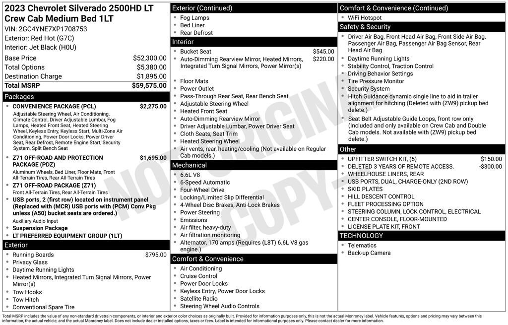 Discover the power and capability of the 2023 Chevrolet Silverado 2500HD LT. This rugged and versatile truck is built to handle any task with ease, whether you're tackling tough jobs or embarking on thrilling adventures.Packed with an impressive array of features, this Silverado 2500HD LT is ready to take on the challenges of your daily life. Enjoy the peace of mind of a FREE CARFAX report and the assurance of our BravoBudget Certified 30-day, 1,000-mile limited powertrain warranty. Plus, with the CARBRAVO 10-day, 500-mile exchange policy, you can drive with confidence knowing you have the flexibility to make the right choice. FREE CARFAX Report BravoBudget Certified 30-day, 1,000-mile limited powertrain warranty CARBRAVO 10-day, 500-mile exchange policyThis Silverado 2500HD LT is equipped with a powerful 6.6L V8 engine and a 6-speed automatic transmission, delivering the performance you need to conquer any terrain. The rugged 4WD system ensures you can tackle the toughest off-road conditions with ease.The Convenience Package adds a wealth of premium features, including dual-zone automatic climate control, 10-way power driver's seat with lumbar support, heated front seats and steering wheel, and a host of other conveniences to make your driving experience more comfortable and enjoyable.The Z71 Off-Road and Protection Package takes your adventures to the next level. Enjoy the off-road-tuned suspension, hill descent control, and skid plates, along with the Chevytec spray-on bedliner and all-weather floor liners to keep your Silverado looking and performing its best.Elevate your driving experience with the Upfitter Switch Kit, providing you with the flexibility to install aftermarket electrical accessories to suit your needs. And with the Chromed Tubular Assist Steps, you'll have easy access to the cabin and cargo bed.Discover the uncompromising capability and refined comfort of the 2023 Chevrolet Silverado 2500HD LT. This truck is built to handle the toughest jobs and the most thrilling adventures, all while keeping you connected and comfortable. Visit our showroom today and experience the power and versatility of this exceptional vehicle.