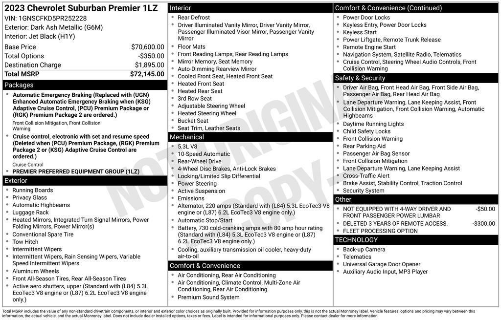 Elevate your driving experience with this exceptional 2023 Chevrolet Suburban Premier. This full-size SUV offers unparalleled capability, refined luxury, and cutting-edge technology, making it the ultimate choice for those who demand the best.- **FREE CARFAX REPORT**- **BravoBudget Certified 30 day 1,000 mile limited powertrain warranty**- **CARBRAVO 10 DAY 500 MILE EXCHANGE (WHICH EVER OCCURS FIRST)**- Navigation System- Bose 10-Speaker Surround w/CenterPoint Premium audio system- Magnetic Ride Control Suspension- Heated and Ventilated Driver and Front Passenger Seats- Power Liftgate- Wireless ChargingPowered by the robust EcoTec3 5.3L V8 engine and mated to a smooth-shifting 10-Speed Automatic transmission, this Suburban Premier delivers exceptional performance and efficiency, with an impressive 20 highway MPG. The sleek Gray exterior exudes a commanding presence, while the spacious and well-appointed interior offers unrivaled comfort and convenience.Experience the pinnacle of luxury and capability with this 2023 Chevrolet Suburban Premier. Boasting a wealth of premium features, including a cutting-edge infotainment system, advanced driver assistance technologies, and a premium Bose audio system, this SUV is designed to elevate your driving experience. The Magnetic Ride Control Suspension provides a smooth and responsive ride, while the heated and ventilated front seats and the heated second-row outboard seats ensure everyone on board enjoys unparalleled comfort.With seating for up to eight passengers and ample cargo space, the Suburban Premier is the perfect companion for your family adventures, weekend getaways, or work-related tasks. The power liftgate and wireless charging capabilities add to the convenience, making this SUV a true standout in its class.We understand that finding the right vehicle can be a daunting task, but with the 2023 Chevrolet Suburban Premier, the choice is clear. This exceptional SUV combines uncompromising performance, luxurious amenities, and advanced technology, making it the ultimate expression of Chevrolet's commitment to excellence.Experience the difference for yourself and schedule a test drive today. We're confident that once you get behind the wheel, you'll be captivated by the Suburban Premier's unparalleled capabilities and refined elegance.