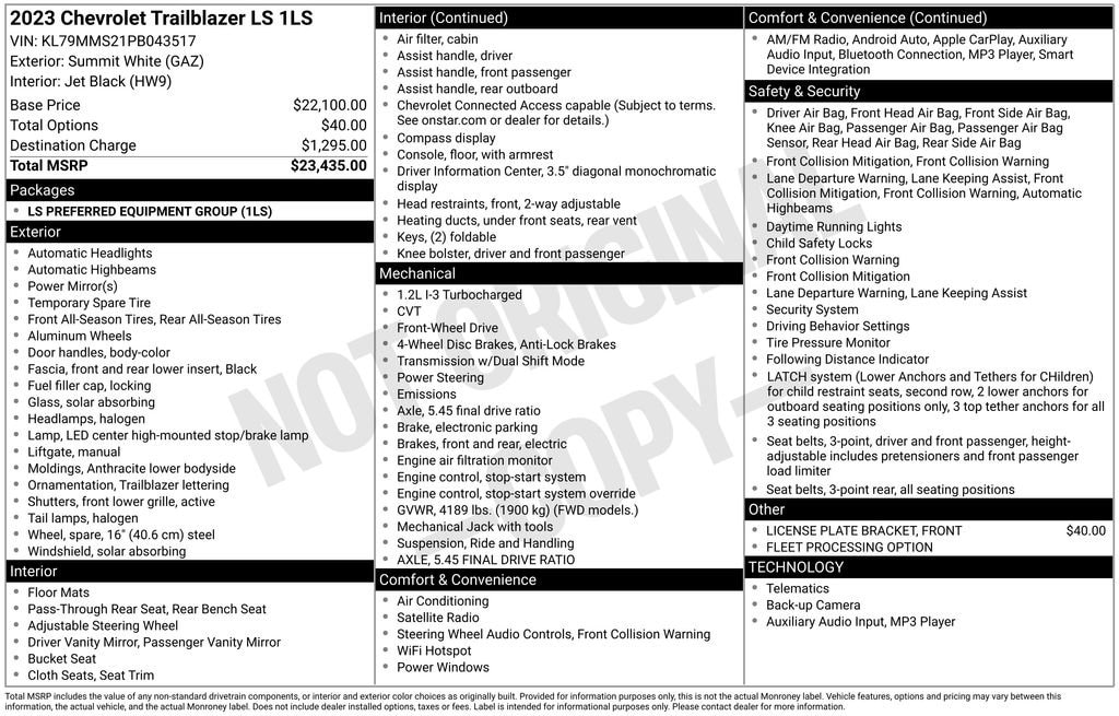 Elevate your driving experience with this exceptional 2023 Chevrolet TrailBlazer LS. Boasting a sleek white exterior and a well-appointed interior, this SUV is poised to exceed your expectations. Powered by a 1.2L Ecotec Turbo DOHC DI engine with VVT, it delivers a dynamic and efficient performance, achieving an impressive 29 city and 31 highway MPG.