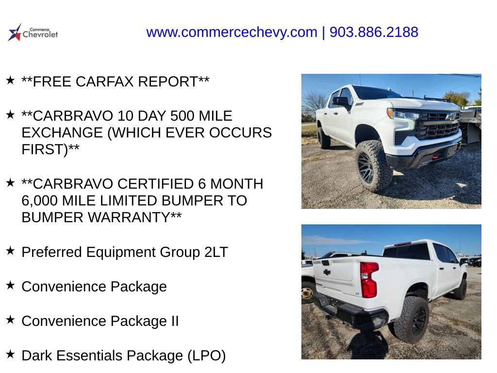 Introducing the 2024 Chevrolet Silverado 1500 LT Trail Boss - a rugged and capable pickup that's ready to take on any adventure. With its powerful EcoTec3 5.3L V8 engine, 4-wheel drive, and impressive towing and hauling capabilities, this Silverado is the perfect companion for your active lifestyle.Highlights of this exceptional vehicle include: FREE CARFAX Report CARBRAVO 10 Day 500 Mile Exchange CARBRAVO Certified 6 Month 6,000 Mile Limited Bumper-to-Bumper Warranty Convenient Trailering Package with Hitch Guidance and Trailer Brake Controller Premium Bose 7-Speaker Sound System Heated Steering Wheel and Heated Front Seats Dual-Zone Automatic Climate Control Keyless Open and Start Integrated Trailer Brake Controller Chevytec Spray-On Black BedlinerThe Silverado LT Trail Boss is designed to tackle any terrain with confidence. Its rugged suspension, locking rear differential, and hill descent control make it a true off-road champion. And with the available Convenience Package II, you'll enjoy even more premium features like a power sliding rear window, universal home remote, and the Trailering App for seamless towing.Inside, the Silverado's spacious and well-appointed cabin offers ample room for passengers and cargo. The 12.3-inch reconfigurable digital display, wireless charging, and available Wi-Fi hotspot keep you connected and entertained on the go. The multi-flex tailgate provides unparalleled versatility, making it easy to load and unload your gear.With its impressive performance, advanced technology, and exceptional utility, the 2024 Chevrolet Silverado 1500 LT Trail Boss is the ultimate choice for those who demand the best. Experience the power and capability of this remarkable truck for yourself. Schedule a test drive today and discover why the Silverado LT Trail Boss is the perfect partner for your next adventure.