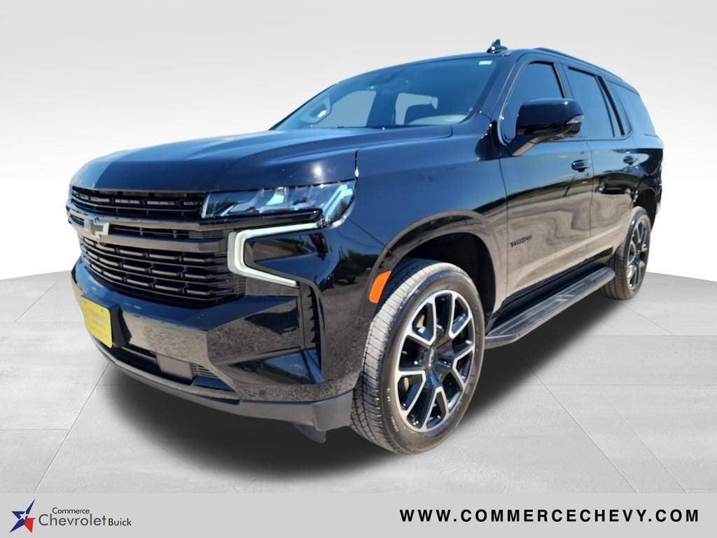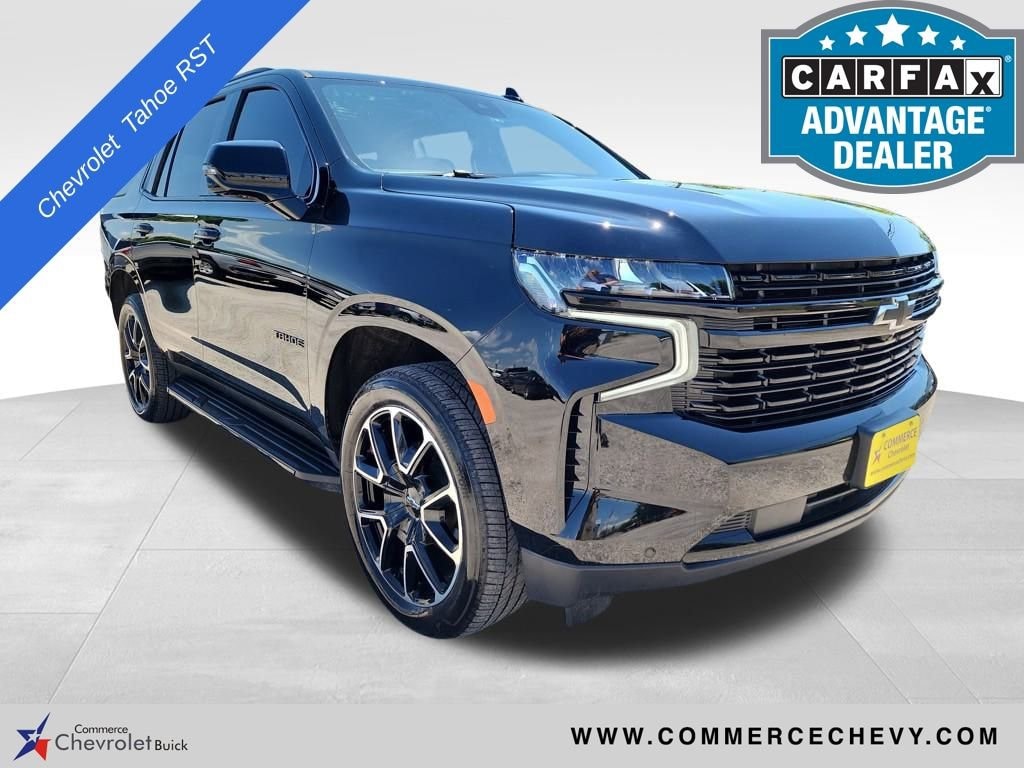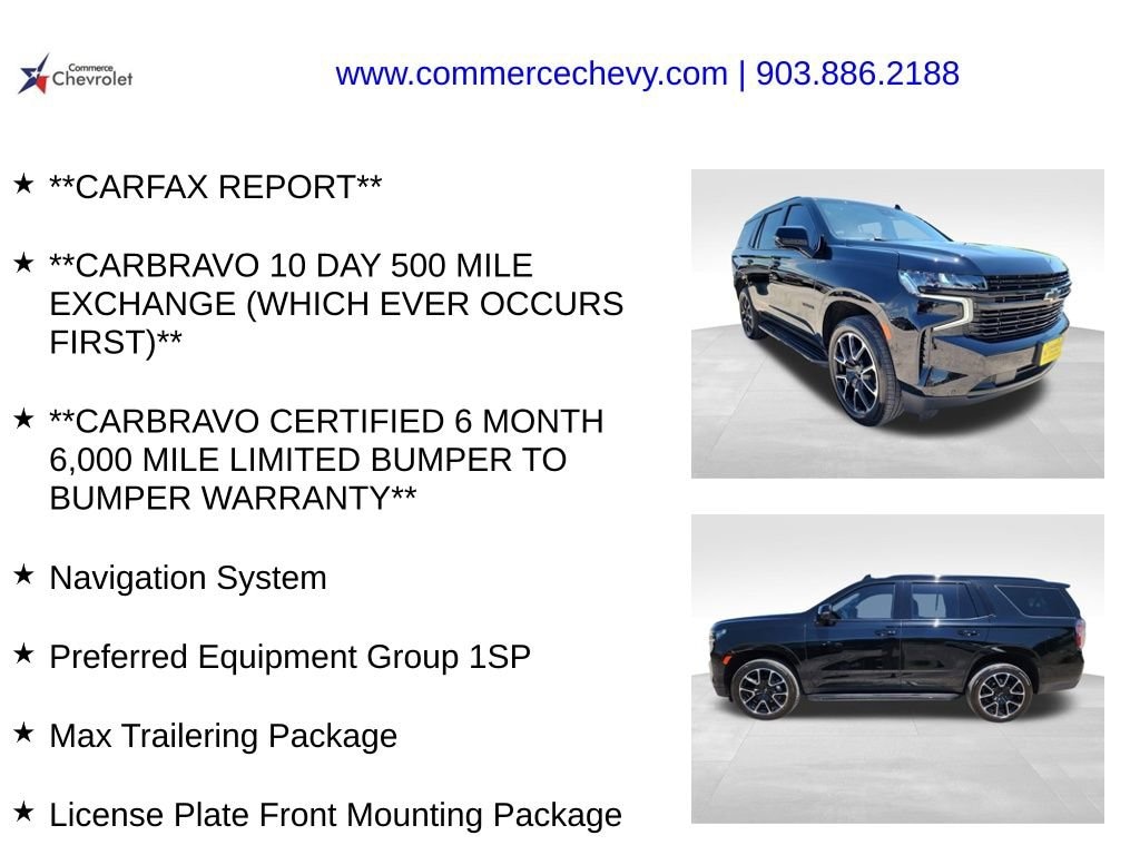 This 2024 Chevrolet Tahoe RST EcoTec3 5.3L V8 10-Speed Automatic with Overdrive RWD in Black comes with the following features: **CARFAX REPORT**, **CARBRAVO 10 DAY 500 MILE EXCHANGE (WHICH EVER OCCURS FIRST)**, and **CARBRAVO CERTIFIED 6 MONTH 6,000 MILE LIMITED BUMPER TO BUMPER WARRANTY** Advanced Trailering Package (Hitch View w/Pan/Zoom Image Adjustment, Integrated Trailer Brake Controller, and Smart Trailer Integration Indicator), Driver Alert Package (Lane Change Alert w/Side Blind Zone Alert and Rear Cross Traffic Alert), License Plate Front Mounting Package, Luxury Package (2nd Row Pwr Release 60/40 Split-Folding Bench Seat, 3rd Row 60/40 Power-Folding Split-Bench Seat, Adaptive Cruise Control, Enhanced Automatic Emergency Braking, HD Surround Vision, Heated 2nd Row Outboard Seats, Heated Steering Wheel, Memory Settings, Outside Heated Power-Adjustable Mirrors, Power Tilt & Telescopic Steering Column, and Rear Pedestrian Alert), Max Trailering Package (Extra Capacity Cooling System), Preferred Equipment Group 1SP (1st & 2nd Row Color-Keyed Carpeted Floor Mats, Auto-Dimming Inside Rear-View Mirror, Bose 9-Speaker Stereo Audio System Feature, Bright Front & Rear Door Sill Plates, Color-Keyed Carpeting Floor Covering, Driver & Front Outboard Passenger Airbags, Enhanced Driver Information Center, Floor Console w/Storage Area, Hands-Free Rear Power Programmable Liftgate, LED Daytime Running Lamps, Memory Settings for Driver, Remote Start, SiriusXM w/360L, Universal Home Remote, Wireless Charging, and Wrapped Steering Wheel), Jet Black/Victory Red Leather, and Navigation System Advanced Trailering Package (Hitch View w/Pan/Zoom Image Adjustment, Integrated Trailer Brake Controller, and Smart Trailer Integration Indicator), Driver Alert Package (Lane Change Alert w/Side Blind Zone Alert and Rear Cross Traffic Alert), License Plate Front Mounting Package, Luxury Package (2nd Row Pwr Release 60/40 Split-Folding Bench Seat, 3rd Row 60/40 Power-Folding Split-Bench Seat, Adaptive Cruise Control, Enhanced Automatic Emergency Braking, HD Surround Vision, Heated 2nd Row Outboard Seats, Heated Steering Wheel, Memory Settings, Outside Heated Power-Adjustable Mirrors, Power Tilt & Telescopic Steering Column, and Rear Pedestrian Alert), Max Trailering Package (Extra Capacity Cooling System), Preferred Equipment Group 1SP (1st & 2nd Row Color-Keyed Carpeted Floor Mats, Auto-Dimming Inside Rear-View Mirror, Bose 9-Speaker Stereo Audio System Feature, Bright Front & Rear Door Sill Plates, Color-Keyed Carpeting Floor Covering, Driver & Front Outboard Passenger Airbags, Enhanced Driver Information Center, Floor Console w/Storage Area, Hands-Free Rear Power Programmable Liftgate, LED Daytime Running Lamps, Memory Settings for Driver, Remote Start, SiriusXM w/360L, Universal Home Remote, Wireless Charging, and Wrapped Steering Wheel), Jet Black/Victory Red Leather, Navigation System, 10-Way Power Driver & Passenger Seat Adjusters, 3.23 Rear Axle Ratio, 3rd row seats: split-bench, 4-Wheel Disc Brakes, 9 Speakers, ABS brakes, Air Conditioning, Alloy wheels, AM/FM radio: SiriusXM with 360L, Apple CarPlay/Android Auto, Auto High-beam Headlights, Auto-dimming Rear-View mirror, Automatic temperature control, Brake assist, Bumpers: body-color, Compass, Delay-off headlights, Driver door bin, Driver vanity mirror, Dual front impact airbags, Dual front side impact airbags, Dual-Pane Power Panoramic Sunroof, Electronic Stability Control, Emergency communication system: OnStar and Chevrolet connected services capable, Four wheel independent suspension, Front anti-roll bar, Front Bucket Seats