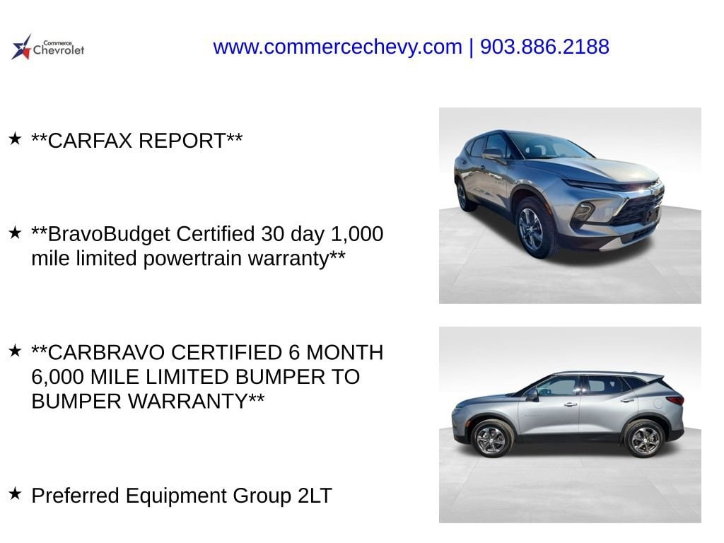 This 2025 Chevrolet Blazer LT 2.0L Turbocharged 9-Speed Automatic with Overdrive FWD in Sterling Gray Metallic comes with the following features: **FREE CARFAX REPORT**, **BravoBudget Certified 30 day 1,000 mile limited powertrain warranty**, and **CARBRAVO CERTIFIED 6 MONTH 6,000 MILE LIMITED BUMPER TO BUMPER WARRANTY** Preferred Equipment Group 2LT Preferred Equipment Group 2LT, 170 Amp Alternator, 3.47 Final Drive Axle Ratio, 4-Way Manual Front Passenger Seat Adjuster, 4-Wheel Disc Brakes, 6 Speakers, 6-Speaker Audio System Feature, 8-Way Power Driver Seat Adjuster, ABS brakes, Air Conditioning, Alloy wheels, AM/FM radio: SiriusXM with 360L, Apple CarPlay/Android Auto, Auto High-beam Headlights, Automatic temperature control, Brake assist, Bumpers: body-color, Child-Seat-Sensing Airbag, Compass, Delay-off headlights, Driver door bin, Driver vanity mirror, Dual front impact airbags, Dual front side impact airbags, Electronic Stability Control, Emergency communication system: OnStar and Chevrolet connected services capable, Four wheel independent suspension, Front anti-roll bar, Front Bucket Seats, Front Center Armrest, Front dual zone A/C, Front reading lights, Fully automatic headlights, Heated door mirrors, Heated Driver & Front Passenger Seats, Heated front seats, Illuminated entry, Knee airbag, Leather Shift Knob, Low tire pressure warning, Occupant sensing airbag, Outside temperature display, Overhead airbag, Overhead console, Panic alarm, Passenger door bin, Passenger vanity mirror, Power door mirrors, Power Driver Lumbar Control, Power driver seat, Power steering, Power windows, Premium audio system: Chevrolet Infotainment 3 Plus, Premium Cloth Seat Trim, Radio data system, Radio: Chevrolet Infotainment 3 Plus System, Rear anti-roll bar, Rear reading lights, Rear seat center armrest, Rear window defroster, Rear window wiper, Remote keyless entry, Ride & Handling Suspension, Security system, SiriusXM w/360L, Speed control, Speed-sensing steering, Split folding rear seat, Spoiler, Steering wheel mounted audio controls, Stop-Start Engine Control System, Tachometer, Telescoping steering wheel, Tilt steering wheel, Traction control, Trip computer, Variably intermittent wipers, Voltmeter, and Wheels: 18 Grazen Metallic Aluminum.