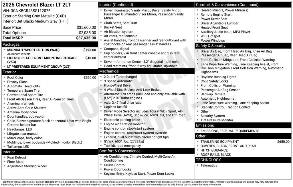 Priced below KBB Fair Purchase Price! CARFAX One-Owner. We are a family owned and operated business. We look forward to serving all your automotive needs, sales, service, parts, and body shop. When it comes to your automotive needs, Commerce Chevrolet has you covered. Contact us today! 903-886-2188.This 2025 Chevrolet Blazer LT 2.0L Turbocharged 9-Speed Automatic with Overdrive FWD in Sterling Gray Metallic comes with the following features: **CARFAX REPORT**, **CARBRAVO 10 DAY 500 MILE EXCHANGE (WHICH EVER OCCURS FIRST)**, and **CARBRAVO CERTIFIED 6 MONTH 6,000 MILE LIMITED BUMPER TO BUMPER WARRANTY** Midnight/Sport Edition (Black Roof-Mounted Side Rails, Front & Rear Black Bowties, and Wheels: 18 High Gloss Black Painted Aluminum), Preferred Equipment Group 2LT, and Trailering Equipment (Hitch Guidance) Midnight/Sport Edition (Black Roof-Mounted Side Rails, Front & Rear Black Bowties, and Wheels: 18 High Gloss Black Painted Aluminum), Preferred Equipment Group 2LT, Trailering Equipment (Hitch Guidance), 170 Amp Alternator, 3.47 Final Drive Axle Ratio, 4-Way Manual Front Passenger Seat Adjuster, 4-Wheel Disc Brakes, 6 Speakers, 6-Speaker Audio System Feature, 8-Way Power Driver Seat Adjuster, ABS brakes, Air Conditioning, Alloy wheels, AM/FM radio: SiriusXM with 360L, Apple CarPlay/Android Auto, Auto High-beam Headlights, Automatic temperature control, Black 2-Tone Roof, Brake assist, Bumpers: body-color, Child-Seat-Sensing Airbag, Compass, Delay-off headlights, Driver door bin, Driver vanity mirror, Dual front impact airbags, Dual front side impact airbags, Electronic Stability Control, Emergency communication system: OnStar and Chevrolet connected services capable, Four wheel independent suspension, Front anti-roll bar, Front Bucket Seats, Front Center Armrest, Front dual zone A/C, Front reading lights, Fully automatic headlights, Heated door mirrors, Heated Driver & Front Passenger Seats, Heated front seats, Illuminated entry, Knee airbag, Leather Shift Knob, Low tire pressure warning, Occupant sensing airbag, Outside temperature display, Overhead airbag, Overhead console, Panic alarm, Passenger door bin, Passenger vanity mirror, Power door mirrors, Power Driver Lumbar Control, Power driver seat, Power steering, Power windows, Premium audio system: Chevrolet Infotainment 3 Plus, Premium Cloth Seat Trim, Radio data system, Radio: Chevrolet Infotainment 3 Plus System, Rear anti-roll bar, Rear reading lights, Rear seat center armrest, Rear window defroster, Rear window wiper, Remote keyless entry, Ride & Handling Suspension, Security system, SiriusXM w/360L, Speed control, Speed-sensing steering, Split folding rear seat, Spoiler, Steering wheel mounted audio controls, Stop-Start Engine Control System, Tachometer, Telescoping steering wheel, Tilt steering wheel, Traction control, Trip computer, Variably intermittent wipers, Voltmeter, and Wheels: 18 Grazen Metallic Aluminum.