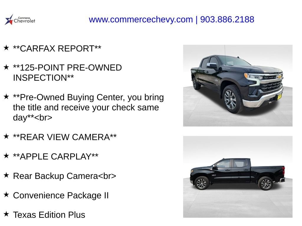 Priced below KBB Fair Purchase Price! CARFAX One-Owner. Clean CARFAX. We are a family owned and operated business. We look forward to serving all your automotive needs, sales, service, parts, and body shop. When it comes to your automotive needs, Commerce Chevrolet has you covered. Contact us today! 903-886-2188.