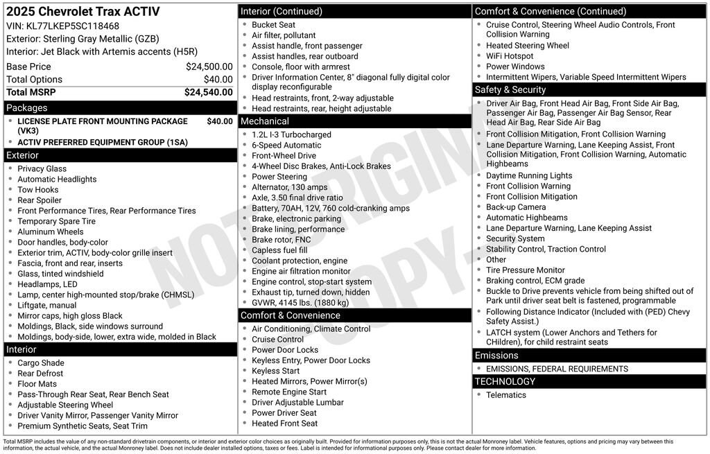 Clean CARFAX. We are a family owned and operated business. We look forward to serving all your automotive needs, sales, service, parts, and body shop. When it comes to your automotive needs, Commerce Chevrolet has you covered. Contact us today! 903-886-2188.This 2025 Chevrolet Trax ACTIV 1.2L Ecotec Turbo DOHC DI w/VVT 6-Speed Automatic FWD in Sterling Gray Metallic comes with the following features: License Plate Front Mounting Package, Preferred Equipment Group 1SA, 2-Way Adjustable Front Head Restraints, 2-Way Power Driver Lumbar Seat Adjuster, 3.50 Final Drive Axle Ratio, 4-Way Manual Front Passenger Seat Adjuster, 4-Wheel Disc Brakes, 6 Speakers, 6-Speaker Audio System Feature, 8-Way Power Driver Seat Adjuster, ABS brakes, Air Conditioning, Alloy wheels, AM/FM radio: SiriusXM, Auto High-beam Headlights, Automatic temperature control, Brake assist, Bumpers: body-color, Compass, Delay-off headlights, Driver door bin, Driver vanity mirror, Dual front impact airbags, Dual front side impact airbags, Electronic Stability Control, Emergency communication system: OnStar One Essentials, Evotex Seat Trim, Exterior Parking Camera Rear, Front anti-roll bar, Front Bucket Seats, Front Center Armrest, Front reading lights, Front wheel independent suspension, Fully automatic headlights, Heated door mirrors, Heated Driver & Front Passenger Seats, Heated front seats, Heated steering wheel, Illuminated entry, Leather steering wheel, Low tire pressure warning, Occupant sensing airbag, Outside temperature display, Overhead airbag, Overhead console, Panic alarm, Passenger door bin, Passenger vanity mirror, Power door mirrors, Power driver seat, Power steering, Power windows, Premium audio system: Chevrolet Infotainment 3, Radio data system, Radio: AM/FM Stereo Audio System, Rear window defroster, Rear window wiper, Remote keyless entry, Security system, SiriusXM Trial Subscription, Speed control, Split folding rear seat, Spoiler, Steering wheel mounted audio controls, Tachometer, Telescoping steering wheel, Tilt steering wheel, Traction control, Trip computer, Variably intermittent wipers, and Wheels: 18 Black-Painted Aluminum.Awards:* Car and Driver 10 BestCar and Driver, January 2017.
