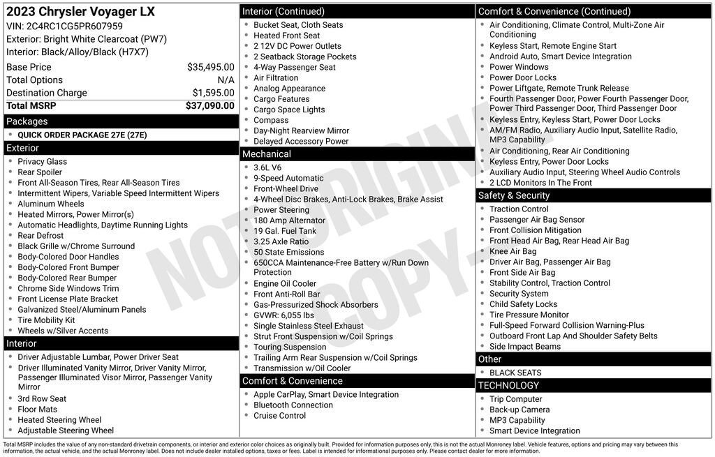 Elevate your driving experience with the 2023 Chrysler Voyager LX. This versatile minivan combines style, comfort, and advanced technology to make every journey a pleasure. With its sleek white exterior and powerful 3.6L V6 engine, the Voyager LX delivers exceptional performance and efficiency, boasting an impressive 19 city/28 highway MPG.- **BravoBudget Certified 30 day 1,000 mile limited powertrain warranty**- **CARBRAVO 10 DAY 500 MILE EXCHANGE (WHICH EVER OCCURS FIRST)**- **FREE CARFAX REPORT**- Apple CarPlay and Google Android Auto integration- Uconnect 5 with 7 display- Automatic temperature control and rear air conditioning- Power driver's seat and heated steering wheel- ParkView Rear Back-Up Camera for easy parkingThe Voyager LX's spacious interior, with seating for up to 7, offers unparalleled versatility. Slide and fold the 3rd-row seat to accommodate your changing cargo needs, while the split-folding rear seat provides ample room for all your belongings. Heated front seats and a host of advanced safety features, including electronic stability control and a comprehensive airbag system, ensure a secure and comfortable ride for you and your passengers.Designed with your convenience in mind, the Voyager LX boasts a power liftgate, remote keyless entry, and steering wheel-mounted audio controls, allowing you to stay connected and in command. The 17-inch aluminum wheels and touring suspension provide a smooth, refined driving experience, while the Uconnect infotainment system with Apple CarPlay and Android Auto integration keeps you entertained and informed.Whether you're transporting the family, running errands, or embarking on a road trip, the 2023 Chrysler Voyager LX is the perfect companion. Its blend of style, functionality, and advanced technology make it a standout in the minivan segment. Experience the difference for yourself visit our showroom and take the Voyager LX for a test drive today.