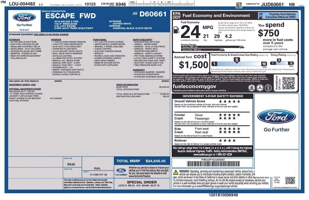 Discover the perfect balance of versatility and efficiency with this 2018 Ford Escape S. This compact SUV offers a compelling blend of practical features, impressive performance, and exceptional value, making it an ideal choice for your next adventure.- **FREE CARFAX REPORT**- **BravoBudget Certified 30 day 1,000 mile limited powertrain warranty**- **CARBRAVO 10 DAY 500 MILE EXCHANGE (WHICH EVER OCCURS FIRST)**Powered by a 2.5L i-VCT engine and a smooth-shifting 6-Speed Automatic transmission, this Escape S delivers an exceptional driving experience. With its front-wheel-drive configuration, you'll enjoy confident handling and impressive fuel efficiency, earning an EPA-estimated 21 MPG in the city and 29 MPG on the highway.Step inside and discover a well-appointed interior that caters to your needs. The SYNC Communications & Entertainment System keeps you connected, while the air conditioning and rear window defroster ensure your comfort, no matter the weather. The power windows, remote keyless entry, and steering wheel-mounted audio controls add to the vehicle's ease of use.Safety is a top priority, with features like dual front impact airbags, dual front side impact airbags, a knee airbag, and electronic stability control ensuring your peace of mind on the road. The 4-Wheel Disc Brakes with ABS provide confident stopping power, while the Exterior Parking Camera Rear helps you navigate tight spaces with ease.Designed with versatility in mind, the Escape S offers a spacious cargo area and a split-folding rear seat, allowing you to accommodate your ever-changing needs. The 17-inch steel wheels with Sparkle Silver-Painted Covers add a touch of style to this practical SUV.Whether you're commuting, running errands, or embarking on a weekend adventure, this 2018 Ford Escape S is ready to take you there. Experience the perfect blend of capability, efficiency, and value visit our showroom today and let us help you discover your next reliable and rewarding ride.