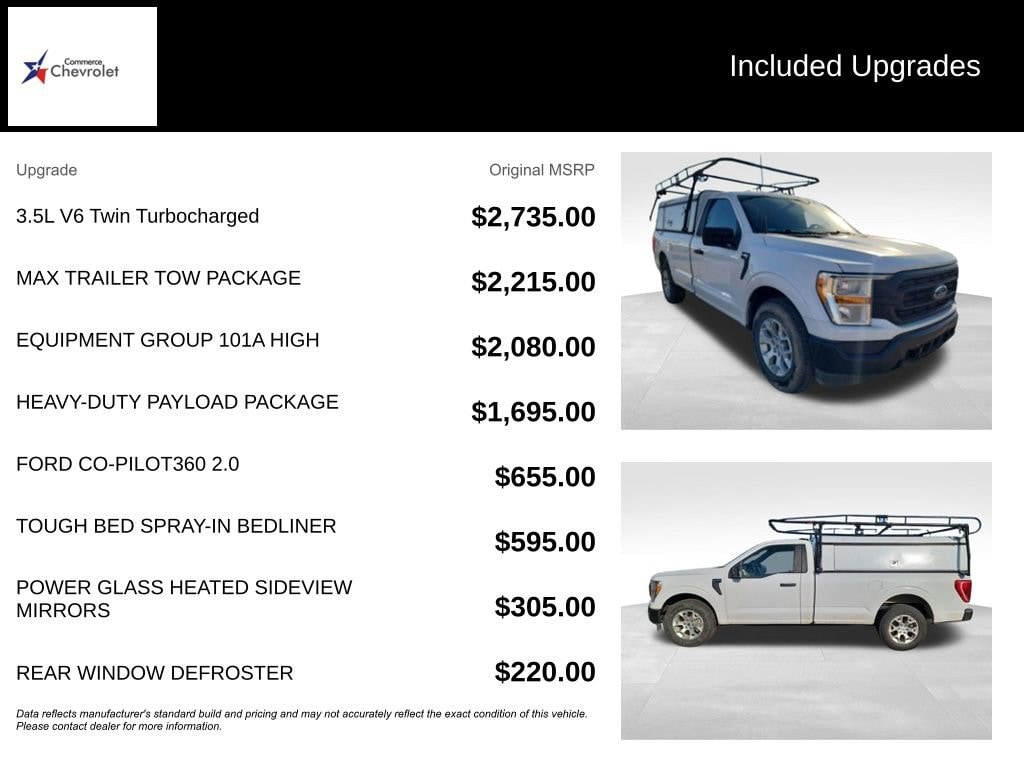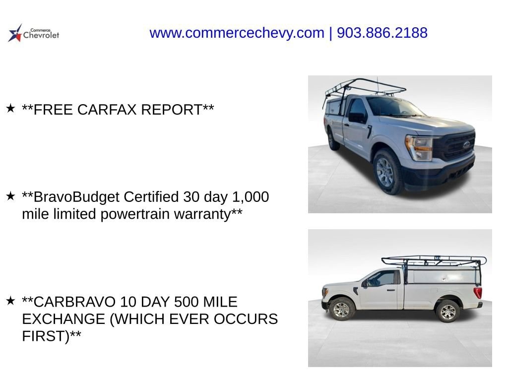 This 2022 Ford F-150 XL 3.5L V6 EcoBoost 10-Speed Automatic RWD in Oxford White comes with the following features: **FREE CARFAX REPORT**, **BravoBudget Certified 30 day 1,000 mile limited powertrain warranty**, and **CARBRAVO 10 DAY 500 MILE EXCHANGE (WHICH EVER OCCURS FIRST)** Equipment Group 101A High (Cruise Control and Reverse Sensing System), Ford Co-Pilot360 2.0 (Auto High Beam, Lane-Keeping System, Post-Collision Braking, Pre-Collision Assist w/Automatic Emergency Braking, Rear-View Camera, and Reverse Brake Assist), GVWR: 6,100 lbs Payload Package, Heavy-Duty Payload Package (18 Silver Painted Aluminum Wheels), Max Trailer Tow Package (Class IV Trailer Hitch Receiver, Extended Range 36 Gallon Fuel Tank, and Integrated Trailer Brake Controller), XL Power Equipment Group (Illuminated Entry, MyKey, Perimeter Alarm, Power Door Locks, Power Front Windows, Power Glass Sideview Mirrors w/Black Skull Caps, and Power Tailgate Lock), 3.55 Axle Ratio, 4 Speakers, 4-Wheel Disc Brakes, ABS brakes, Air Conditioning, AM/FM radio, AM/FM Stereo w/4 Speakers, Auto High-beam Headlights, Auto-Dimming Rear-View Mirror, Brake assist, Cloth 40/20/40 Front Seat, Compass, Delay-off headlights, Driver door bin, Dual front impact airbags, Dual front side impact airbags, Electronic Stability Control, Emergency communication system: SYNC 4 911 Assist, Exterior Parking Camera Rear, Front anti-roll bar, Front Center Armrest, Front License Plate Bracket, Front reading lights, Front wheel independent suspension, Fully automatic headlights, Interior Work Surface, LED Sideview Mirror Spotlights, Low tire pressure warning, Occupant sensing airbag, Outside temperature display, Overhead airbag, Overhead console, Passenger door bin, Passenger vanity mirror, Power Glass Heated Sideview Mirrors, Power steering, Radio data system, Rear step bumper, Rear Window Defroster, Rear Window Fixed Privacy Glass, Speed-sensing steering, Steering wheel mounted audio controls, SYNC 4, Tachometer, Telescoping steering wheel, Tilt steering wheel, Tough Bed Spray-In Bedliner, Traction control, Trip computer, Variably intermittent wipers, Voltmeter, Wheels: 17 Silver Painted Aluminum, and Wheels: 17 Silver Steel.