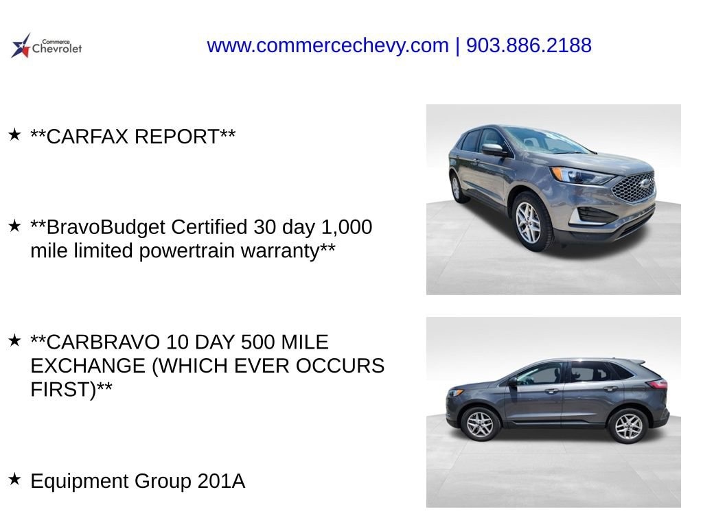 This 2023 Ford Edge SEL EcoBoost 2.0L I4 GTDi DOHC Turbocharged VCT 8-Speed Automatic AWD in Carbonized Gray Metallic comes with the following features: **CARFAX REPORT**, **BravoBudget Certified 30 day 1,000 mile limited powertrain warranty**, and **CARBRAVO 10 DAY 500 MILE EXCHANGE (WHICH EVER OCCURS FIRST)** Equipment Group 201A and AWD Equipment Group 201A, AWD, 3.80 Axle Ratio, 4-Wheel Disc Brakes, 6 Speakers, ABS brakes, ActiveX Seating Material Heated Bucket Seats, Air Conditioning, Alloy wheels, AM/FM radio: SiriusXM with 360L, Auto High-beam Headlights, Auto-dimming Rear-View mirror, Automatic temperature control, Brake assist, Bumpers: body-color, Compass, Delay-off headlights, Driver door bin, Driver vanity mirror, Dual front impact airbags, Dual front side impact airbags, Electronic Stability Control, Emergency communication system: SYNC 4 911 Assist, FordPass Connect, Four wheel independent suspension, Front anti-roll bar, Front Bucket Seats, Front Center Armrest w/Storage, Front dual zone A/C, Front reading lights, Fully automatic headlights, Heated door mirrors, Heated front seats, Illuminated entry, Knee airbag, Leather steering wheel, Leather-Wrapped Steering Wheel, Low tire pressure warning, Occupant sensing airbag, Outside temperature display, Overhead airbag, Overhead console, Panic alarm, Passenger door bin, Passenger vanity mirror, Power door mirrors, Power driver seat, Power passenger seat, Power steering, Power windows, Radio: AM/FM Stereo/MP3 Capable, Rear anti-roll bar, Rear Parking Sensors, Rear reading lights, Rear seat center armrest, Rear window defroster, Rear window wiper, Remote keyless entry, SiriusXM w/360L, Speed control, Speed-Sensitive Wipers, Split folding rear seat, Spoiler, Steering wheel mounted audio controls, SYNC 4A w/Enhanced Voice Recognition, Tachometer, Telescoping steering wheel, Tilt steering wheel, Traction control, Trip computer, Variably intermittent wipers, and Wheels: 18 Sparkle Silver-Painted Aluminum.
