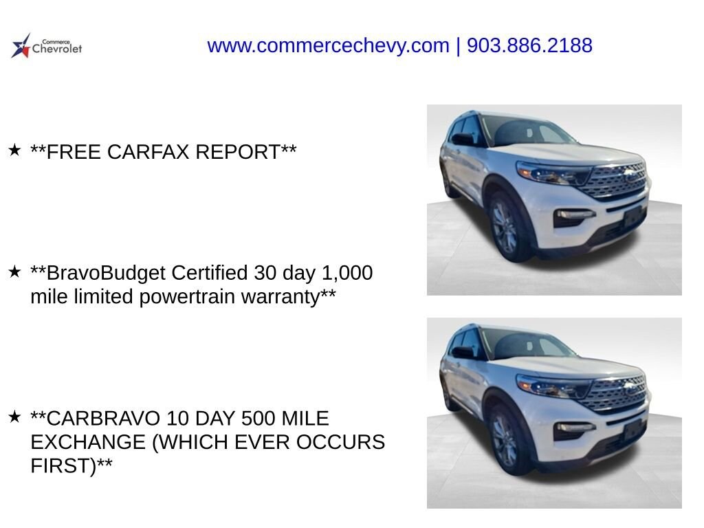 Discover the exceptional 2023 Ford Explorer Limited, a versatile and well-equipped SUV that elevates your driving experience. With its sleek exterior, advanced technology, and impressive performance, this Explorer is poised to exceed your expectations.Elevate your journey with the following premium features: FREE CARFAX REPORT BravoBudget Certified 30 day 1,000 mile limited powertrain warranty CARBRAVO 10 DAY 500 MILE EXCHANGE (WHICH EVER OCCURS FIRST) Heated/Ventilated Captain's Chairs Voice-Activated Touchscreen Navigation System 12-Speaker B&O Sound System Power Tilt/Telescoping Steering Column 3rd Row PowerFold Seat 110V/150W AC Power OutletThis Explorer Limited is powered by a robust 2.3L EcoBoost I-4 engine, delivering an impressive 21 city / 28 highway MPG. Paired with a smooth-shifting 10-Speed Automatic transmission, this SUV provides the perfect balance of power and efficiency.Step inside and experience the refined interior, featuring premium leather seating, a heated steering wheel, and a host of advanced technology. The SYNC 3 infotainment system with Apple CarPlay and Android Auto integration keeps you connected and entertained on the go. The spacious cabin and versatile cargo area make this Explorer the perfect companion for your family adventures and everyday errands.Safety is paramount, and the Explorer Limited is equipped with a comprehensive suite of advanced driver-assist technologies, including Blind Spot Monitoring, Rear Cross-Traffic Alert, and a Surround-View Camera System. These features work seamlessly to help keep you and your loved ones secure on the road.With its exceptional capabilities, premium amenities, and advanced safety features, the 2023 Ford Explorer Limited is a true standout in the SUV segment. Experience the difference for yourself by scheduling a test drive at our dealership. We're confident this Explorer will exceed your expectations and become the perfect addition to your lifestyle.
