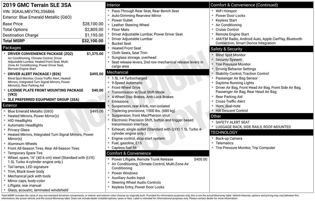 Discover the perfect blend of style, performance, and convenience in this 2019 GMC Terrain SLE. This exceptional SUV offers a compelling combination of features that cater to your every need, making it an ideal choice for the discerning driver.- **FREE CARFAX REPORT**- **BravoBudget Certified 30 day 1,000 mile limited powertrain warranty**- **CARBRAVO 10 DAY 500 MILE EXCHANGE (WHICH EVER OCCURS FIRST)**- Driver Alert Package I- Driver Convenience Package- License Plate Front Mounting PackageBoasting a sleek and modern exterior in the captivating Blue Emerald Metallic color, this Terrain SLE commands attention wherever it goes. Under the hood, the 1.5L DOHC engine paired with a 9-Speed Automatic transmission delivers an impressive fuel efficiency of 26 city/30 highway MPG, ensuring you can go further on every tank.Step inside and experience the refined interior, where premium cloth seating and the Driver Convenience Package elevate your driving experience. Dual-zone automatic climate control, heated front seats, and an 8-way power driver's seat with lumbar support provide unparalleled comfort, while the Rear Park Assist and Rear Cross-Traffic Alert keep you confident and in control.Connectivity is at your fingertips with the GMC Infotainment Audio System, featuring a 7-inch display, Apple CarPlay, and Android Auto integration. Stay entertained and informed on every journey with the 6-speaker audio system and seamless Bluetooth connectivity.Safety is a top priority in the Terrain SLE, with features like Lane Change Alert with Side Blind Zone Alert, Rear Cross-Traffic Alert, and the innovative Safety Alert Seat keeping you and your loved ones protected. The Power Programmable Rear Liftgate adds convenience, making loading and unloading a breeze.This 2019 GMC Terrain SLE is a remarkable SUV that combines style, performance, and advanced technology to elevate your driving experience. Visit our showroom today and discover the true potential of this exceptional vehicle. We're confident you'll be impressed by its capabilities and eager to make it your own.