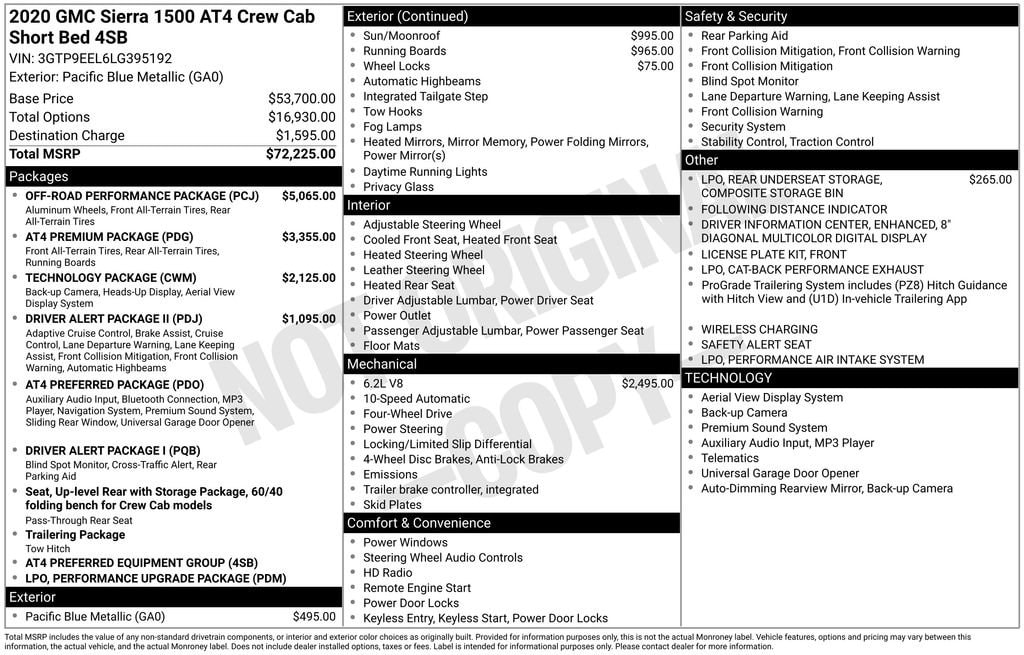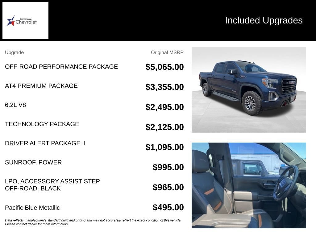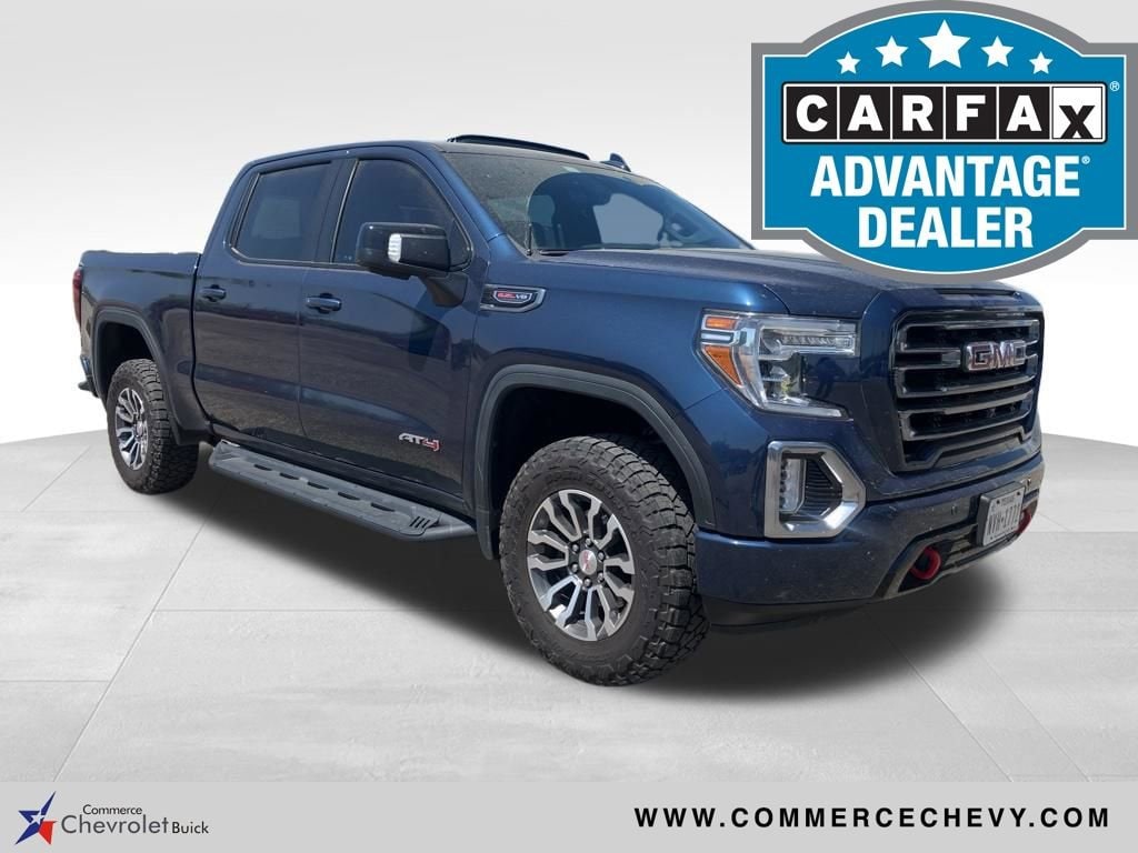 Priced below KBB Fair Purchase Price! We are a family owned and operated business. We look forward to serving all your automotive needs, sales, service, parts, and body shop. When it comes to your automotive needs, Commerce Chevrolet has you covered. Contact us today! 903-886-2188.This 2020 GMC Sierra 1500 AT4 EcoTec3 6.2L V8 10-Speed Automatic 4WD in Pacific Blue Metallic comes with the following features: 10-Speed Automatic, 4WD, and Jet Black With Kalahari Accents Leather AT4 Preferred Package (Power Sliding Rear Window w/Rear Defogger, Premium Bose 7-Speaker Sound System, Radio: Premium GMC Infotainment Sys w/Navigation, SiriusXM w/360L, Universal Home Remote, and Wireless Charging), AT4 Premium Package, Driver Alert Package I (Lane Change Alert w/Side Blind Zone Alert, Perimeter Lighting, Rear Cross Traffic Alert, and Ultrasonic Front & Rear Park Assist), Driver Alert Package II (Adaptive Cruise Control - Camera, Automatic Emergency Braking, Following Distance Indicator, Forward Collision Alert, Front Pedestrian Braking, IntelliBeam Automatic High Beam On/Off, Lane Keep Assist w/Lane Departure Warning, and Safety Alert Seat), Off Road Performance Package, Performance Upgrade Package (LPO) (Cat-Back Performance Exhaust (LPO) and Performance Air Intake System (LPO)), Preferred Equipment Group 4SB (12-Volt Rear Auxiliary Power Outlet, 120-Volt Bed Mounted Power Outlet, 120-Volt Instrument Panel Power Outlet, 170 Amp Alternator, 2 USB Ports, 2 USB Ports (1st Row), 4.2 Diagonal Color Display Driver Info Center, 4G LTE Wi-Fi Hotspot Capable, All-Weather Floor Liners w/AT4 Logo (LPO), Auxiliary External Transmission Oil Cooler, Body-Color Surround Grille, Color-Keyed Carpeting Floor Covering, Compass, Deep-Tinted Glass, Electric Rear-Window Defogger, Electrical Lock Control Steering Column, Floor-Mounted Center Console, GMC Connected Access Capable, HD Radio, HD Rear Vision Camera, Heated 2nd Row Outboard Seats, Heated Driver & Front Outboard Passenger Seating, Heavy-Duty Rear Locking Differential, High-Capacity Air Filter, Hill Descent Control, Hitch Guidance, Hitch Guidance w/Hitch View, In-Vehicle Trailering App, Integrated Trailer Brake Controller, Keyless Open & Start, LED Cargo Area Lighting, Manual Tilt-Wheel & Telescoping Steering Column, OnStar & GMC Connected Services Capable, Power Door Locks, Power Front Passenger Windows w/Express Up/Down, Power Front Windows w/Driver Express Up/Down, Power Rear Windows w/Express Down, ProGrade Trailering System, Rear Dual USB Charging-Only Ports, Rear Wheelhouse Liners, Red Recovery Hooks, Remote Vehicle Starter System, Spray-On Pickup Bed Liner w/AT4 Logo, Steering Wheel Audio Controls, Theft Deterrent System (Unauthorized Entry), and Ventilated Driver & Front Passenger Seats), Technology Package (8 Driver Information Center, Bed View Camera, HD Surround Vision w/2 Trailer View Camera Provisions, High Gloss Black Mirror Caps, Multicolor 15 Diagonal Head-Up Display, and Rear Camera Mirror), Trailering Package, 10-Speed Automatic, 4WD, Jet Black With Kalahari Accents Leather, 10-Way Power Driver Seat Adjuster w/Lumbar, 10-Way Power Passenger Seat Adjuster w/Lumbar, 18 x 8.5 Machined Aluminum Wheels, 3.23 Rear Axle Ratio, 4-Wheel Disc Brakes, 6 Speakers, 6-Speaker Audio System Feature, ABS brakes, Air Conditioning, Alloy wheels, AM/FM radio: SiriusXM with 360L, Apple CarPlay/Android Auto, Auto-dimming door mirrors, Auto-dimming Rear-View mirror, Automatic temperature control, Black Off-Road Accessory Assist Step (LPO), Brake assist, Bumpers: body-color, Delay-off headlights, Driver door bin, Driver Memory, Driver vanity mirror, Dual front impact airbags, Dual front side impact airbags, Electronic Stability Control, Front anti-roll bar, Front Bucket Seats, Front Center Armrest, Front dual zone A/C, Front fog lights, Front License Plate Kit, Front reading lights, Front wheel independent suspension, Fully automatic headlights, Heated door mirrors, Heated front seats, Heated