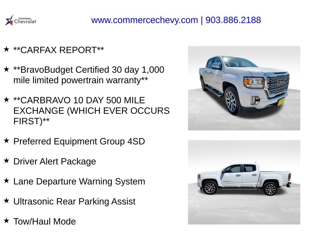 This 2021 GMC Canyon Denali V6 8-Speed Automatic 4WD in Summit White comes with the following features: **FREE CARFAX REPORT**, **BravoBudget Certified 30 day 1,000 mile limited powertrain warranty**, and **CARBRAVO 10 DAY 500 MILE EXCHANGE (WHICH EVER OCCURS FIRST)** Driver Alert Package (Forward Collision Alert and Lane Departure Warning System), Preferred Equipment Group 4SD (5 Rectangular Chrome Assist Steps, Black Spray-On Bedliner w/GMC Logo, Heated Steering Wheel, Hitch Guidance, Polished Exhaust Tip, Tow/Haul Mode, Ultrasonic Rear Parking Assist, Ventilated Driver Seat, and Ventilated Front Passenger Seat), and 4WD Driver Alert Package (Forward Collision Alert and Lane Departure Warning System), Preferred Equipment Group 4SD (5 Rectangular Chrome Assist Steps, Black Spray-On Bedliner w/GMC Logo, Heated Steering Wheel, Hitch Guidance, Polished Exhaust Tip, Tow/Haul Mode, Ultrasonic Rear Parking Assist, Ventilated Driver Seat, and Ventilated Front Passenger Seat), Trailering Package, 4WD, 2 USB Data Ports, 3.42 Rear Axle Ratio, 4-Way Power Front Passenger Seat Adjuster, 4-Wheel Disc Brakes, 7 Speakers, ABS brakes, Air Conditioning, Alloy wheels, AM/FM radio: SiriusXM with 360L, Apple CarPlay/Android Auto, Auto-dimming Rear-View mirror, Automatic temperature control, Bose Premium 7-Speaker Audio System Feature, Bumpers: body-color, Compass, Delay-off headlights, Driver 6-Way Power Seat Adjuster, Driver door bin, Driver vanity mirror, Dual front impact airbags, Dual front side impact airbags, Electronic Stability Control, Exterior Parking Camera Rear, Front anti-roll bar, Front Bucket Seats, Front Center Armrest, Front fog lights, Front License Plate Kit, Front reading lights, Front wheel independent suspension, Fully automatic headlights, Genuine wood console insert, Genuine wood door panel insert, HD Radio, Heated door mirrors, Heated Driver & Front Passenger Seats, Heated front seats, Heated steering wheel, Illuminated entry, Low tire pressure warning, Navigation System, Occupant sensing airbag, Outside temperature display, Overhead airbag, Overhead console, Panic alarm, Passenger door bin, Passenger vanity mirror, Perforated Leather-Appointed Seat Trim, Power door mirrors, Power Driver Lumbar Control Seat Adjuster, Power driver seat, Power Passenger Lumbar Control Seat Adjuster, Power passenger seat, Power steering, Power windows, Premium audio system: GMC Infotainment System, Radio data system, Radio: AM/FM w/8 Diagonal Multi-Touch Display Nav, Rear reading lights, Rear seat center armrest, Rear step bumper, Rear window defroster, Remote keyless entry, Security system, SiriusXM Radio, Speed control, Speed-sensing steering, Steering wheel mounted audio controls, Tachometer, Telescoping steering wheel, Tilt steering wheel, Traction control, Trip computer, Variably intermittent wipers, Ventilated front seats, and Wheels: 20 x 8.5 Diamond Cut Machined Aluminum.
