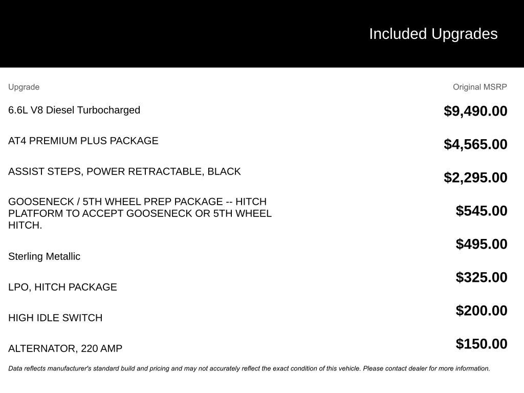 - Engine : Duramax 6.6L V-8 diesel direct injection, intercooled turbo, diesel, engine with 470HP