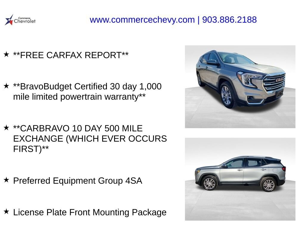 This 2024 GMC Terrain SLT 1.5L DOHC 9-Speed Automatic AWD in Sterling Metallic comes with the following features: **FREE CARFAX REPORT**, **BravoBudget Certified 30 day 1,000 mile limited powertrain warranty**, and **CARBRAVO 10 DAY 500 MILE EXCHANGE (WHICH EVER OCCURS FIRST)** License Plate Front Mounting Package, Preferred Equipment Group 4SA, and AWD License Plate Front Mounting Package, Preferred Equipment Group 4SA, AWD, 2 USB Data Ports, 2 USB Data Ports w/SD Card Reader, 3.47 Final Drive Axle Ratio, 4-Wheel Disc Brakes, 6 Speakers, 6-Speaker Audio System Feature, 6-Way Power Front Passenger Seat, 8-Way Power Driver Seat Adjuster, ABS brakes, Air Conditioning, Alloy wheels, AM/FM radio: SiriusXM, Auto High-beam Headlights, Auto-dimming Rear-View mirror, Automatic temperature control, Bluetooth® For Phone, Brake assist, Bumpers: body-color, Cold Air Grille Shutter, Compass, Delay-off headlights, Deleted 3 Years of Remote Access, Driver & Front Passenger Heated Seats, Driver door bin, Driver vanity mirror, Dual front impact airbags, Dual front side impact airbags, Electronic Stability Control, Emergency communication system: OnStar and GMC connected services capable, Engine Block Heater, Four wheel independent suspension, Front anti-roll bar, Front Bucket Seats, Front Center Armrest, Front dual zone A/C, Front fog lights, Front Passenger 2-Way Power Lumbar, Front reading lights, Fully automatic headlights, Garage door transmitter, Heated door mirrors, Heated front seats, Heated steering wheel, Illuminated entry, Low tire pressure warning, Memory seat, Not Equipped w/Seasonal Lower Grille Cover, Occupant sensing airbag, Outside temperature display, Overhead airbag, Overhead console, Panic alarm, Passenger door bin, Passenger vanity mirror, Perforated Leather-Appointed Seat Trim, Power door mirrors, Power Driver Lumbar Control, Power driver seat, Power Liftgate, Power passenger seat, Power steering, Power windows, Radio data system, Radio: GMC Infotainment Audio System w/8 Display, Rear anti-roll bar, Rear seat center armrest, Rear window defroster, Rear window wiper, Remote keyless entry, Roof rack: rails only, Security system, SiriusXM, Speed control, Speed-sensing steering, Split folding rear seat, Spoiler, Steering wheel mounted audio controls, Tachometer, Telescoping steering wheel, Tilt steering wheel, Traction control, Trip computer, Turn signal indicator mirrors, Variably intermittent wipers, Wheels: 18 x 7 Silver Painted Aluminum, and Wireless Apple CarPlay/Wireless Android Auto.