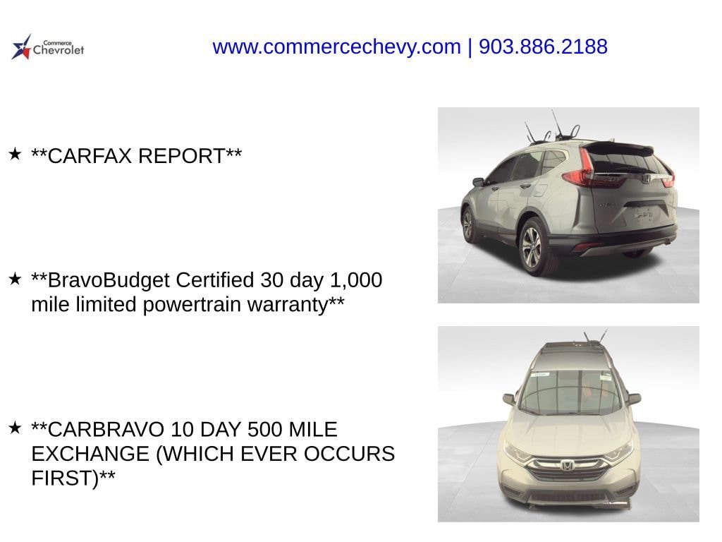 This 2019 Honda CR-V LX 2.4L I4 DOHC 16V i-VTEC CVT AWD in White comes with the following features: **CARFAX REPORT**, **BravoBudget Certified 30 day 1,000 mile limited powertrain warranty**, and **CARBRAVO 10 DAY 500 MILE EXCHANGE (WHICH EVER OCCURS FIRST)** AWD AWD, 17 Alloy Wheels, 4 Speakers, 4-Wheel Disc Brakes, 5.05 Axle Ratio, ABS brakes, Air Conditioning, Alloy wheels, AM/FM radio, Automatic temperature control, Brake assist, Bumpers: body-color, Cloth Seat Trim, Delay-off headlights, Driver door bin, Driver vanity mirror, Dual front impact airbags, Dual front side impact airbags, Electronic Stability Control, Exterior Parking Camera Rear, Four wheel independent suspension, Front anti-roll bar, Front Bucket Seats, Front Center Armrest, Front reading lights, Illuminated entry, Low tire pressure warning, Occupant sensing airbag, Outside temperature display, Overhead airbag, Overhead console, Panic alarm, Passenger door bin, Passenger vanity mirror, Power door mirrors, Power steering, Power windows, Radio data system, Radio: AM/FM Audio System w/4 Speakers, Rear anti-roll bar, Rear seat center armrest, Rear window defroster, Rear window wiper, Remote keyless entry, Speed control, Speed-sensing steering, Split folding rear seat, Spoiler, Steering wheel mounted audio controls, Tachometer, Telescoping steering wheel, Tilt steering wheel, Traction control, and Trip computer.