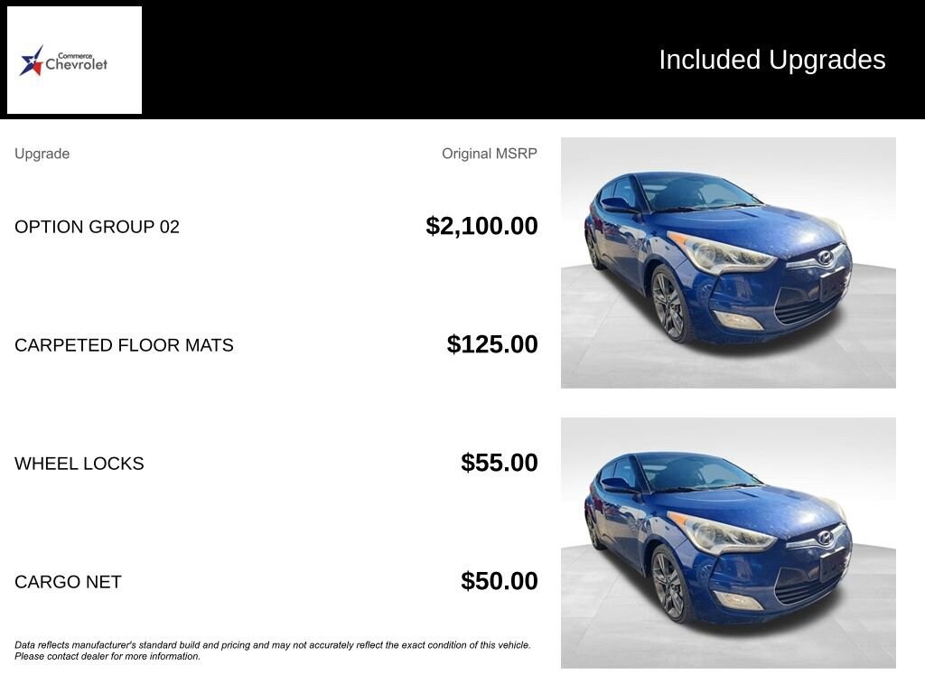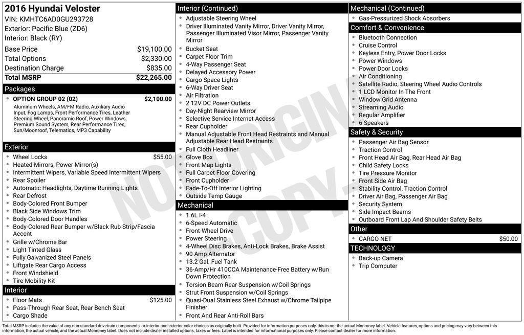 This 2016 Hyundai Veloster 1.6L I4 DGI DOHC 16V ULEV II 132hp 6-Speed EcoShift Dual Clutch FWD in Pacific Blue Pearl comes with the following features: 17 x 7.0J Alloy Wheels, 4-Wheel Disc Brakes, 6 Speakers, ABS brakes, Air Conditioning, Alloy wheels, AM/FM radio: SiriusXM, Brake assist, Bumpers: body-color, Cargo Net, Carpeted Floor Mats, CD player, Cloth Seat Trim w/Leatherette Bolsters, Driver door bin, Driver vanity mirror, Dual front impact airbags, Dual front side impact airbags, Electronic Stability Control, Exterior Parking Camera Rear, Front anti-roll bar, Front Bucket Seats, Front Center Armrest w/Storage, Front reading lights, Front wheel independent suspension, Heated door mirrors, Illuminated entry, Leather Shift Knob, Low tire pressure warning, Occupant sensing airbag, Option Group 02, Outside temperature display, Overhead airbag, Overhead console, Panic alarm, Passenger door bin, Passenger vanity mirror, Power door mirrors, Power steering, Power windows, Premium Cloth Seat Trim, Radio: AM/FM/SiriusXM/CD/MP3 Audio System, Radio: AM/FM/SiriusXM/CD/MP3 Dimension Premium, Rear anti-roll bar, Rear window defroster, Rear window wiper, Remote keyless entry, Security system, Speed control, Speed-sensing steering, Split folding rear seat, Spoiler, Steering wheel mounted audio controls, Tachometer, Telescoping steering wheel, Tilt steering wheel, Traction control, Trip computer, Variably intermittent wipers, and Wheel Locks.