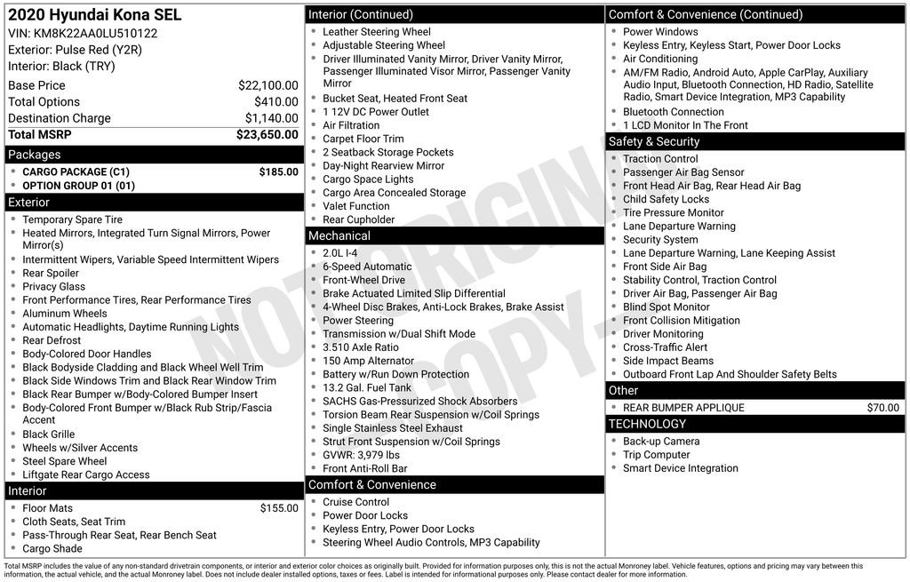 This Kona SEL comes equipped with an impressive array of features:
