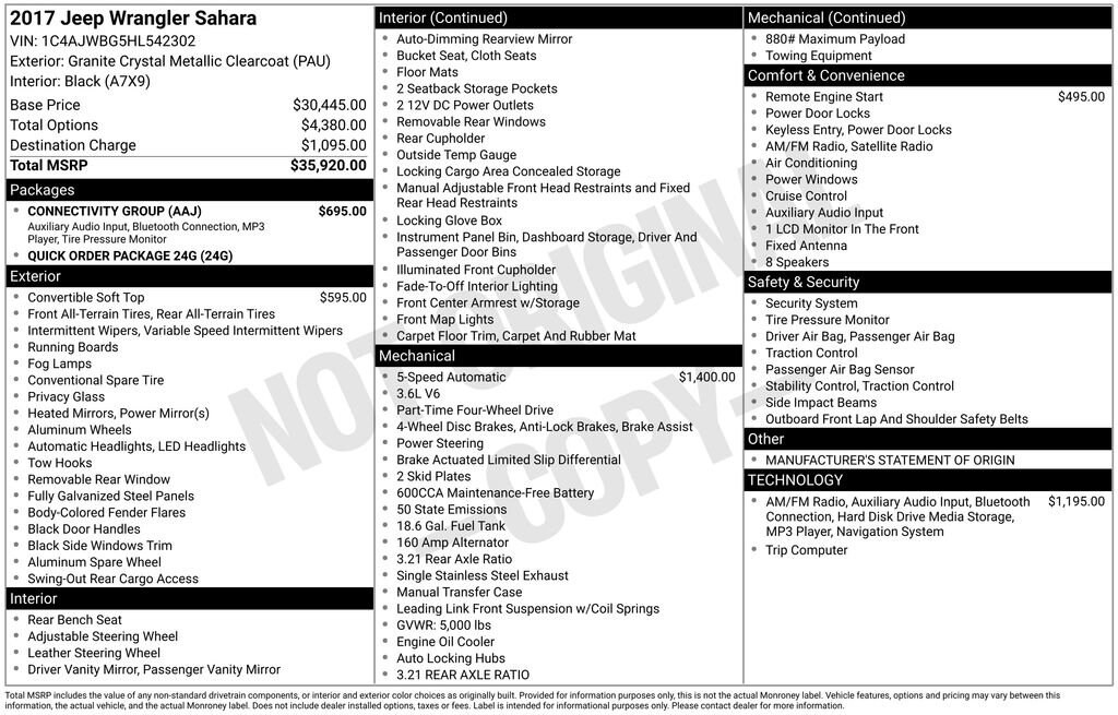 Discover the perfect blend of rugged capability and modern comfort in this 2017 Jeep Wrangler Sahara. With its powerful 3.6L V6 engine, 4-wheel drive prowess, and a wealth of premium features, this Wrangler is ready to elevate your driving experience.- **FREE CARFAX REPORT**- **BravoBudget Certified 30 day 1,000 mile limited powertrain warranty**- **CARBRAVO 10 DAY 500 MILE EXCHANGE (WHICH EVER OCCURS FIRST)**- 6.5 Touchscreen Display- Remote USB Port- 5-Year SiriusXM Travel Link Service- 40GB Hard Drive with 28GB Available- GPS Navigation- Uconnect Voice Command with Bluetooth- Premium Black Sunrider Soft Top- Remote Start SystemThis Wrangler Sahara offers the perfect blend of rugged capability and modern comfort. The powerful 3.6L V6 engine, paired with a 5-speed automatic transmission, delivers exceptional performance both on and off the road. With 4-wheel drive, you'll conquer any terrain with confidence, while features like Hill Descent Control and the Connectivity Group ensure a seamless, connected driving experience.Inside, the premium cabin boasts a wealth of tech-savvy amenities. The 6.5 touchscreen display with GPS navigation and 40GB hard drive keeps you informed and entertained, while the Uconnect voice command with Bluetooth and remote USB port allow you to stay connected on the go. The Premium Black Sunrider Soft Top and remote start system add an extra layer of convenience and versatility.Whether you're seeking a capable off-road companion or a stylish daily driver, this 2017 Jeep Wrangler Sahara is the perfect choice. With its impressive performance, premium features, and uncompromising Jeep heritage, this Wrangler is sure to exceed your expectations. Visit our showroom today and experience the thrill of driving this remarkable vehicle for yourself.