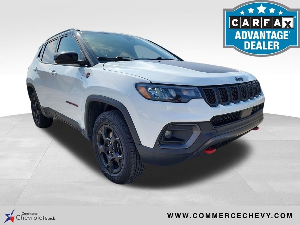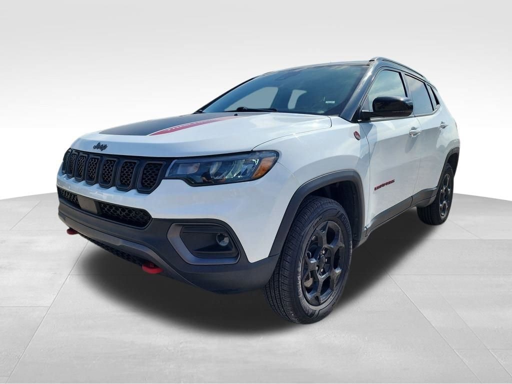 This 2023 Jeep Compass Trailhawk 2.0L I4 DOHC 8-Speed Automatic 4WD in Bright White Clearcoat comes with the following features: 4WD Quick Order Package 29E, 4WD, 10.1 Touchscreen Display, 4-Wheel Disc Brakes, 4.398 Final Drive Ratio, 6 Speakers, ABS brakes, Air Conditioning, Alloy wheels, AM/FM radio: SiriusXM, Auto High-beam Headlights, Auto-dimming Rear-View mirror, Automatic temperature control, Brake assist, Bumpers: body-color, Compass, Delay-off headlights, Disassociated Touchscreen Display, Driver door bin, Driver vanity mirror, Dual front impact airbags, Dual front side impact airbags, Electronic Stability Control, Four wheel independent suspension, Front anti-roll bar, Front Bucket Seats, Front Center Armrest w/Storage, Front dual zone A/C, Front fog lights, Front License Plate Bracket, Front reading lights, Fully automatic headlights, Heated door mirrors, Illuminated entry, Knee airbag, Leather Shift Knob, Low tire pressure warning, Occupant sensing airbag, Outside temperature display, Overhead airbag, Overhead console, Panic alarm, ParkView Rear Back-Up Camera, Passenger door bin, Passenger vanity mirror, Power door mirrors, Power steering, Power windows, Premium Cloth/Leather Trim Bucket Seats, Radio: Uconnect 5 w/10.1 Display, Rain sensing wipers, Rear anti-roll bar, Rear seat center armrest, Rear window defroster, Rear window wiper, Remote keyless entry, Security system, SiriusXM Radio Service, Speed control, Split folding rear seat, Spoiler, Steering wheel mounted audio controls, Tachometer, Telescoping steering wheel, Tilt steering wheel, Traction control, Trip computer, Turn signal indicator mirrors, Variably intermittent wipers, and Wheels: 17 x 6.5 Painted Black Aluminum.