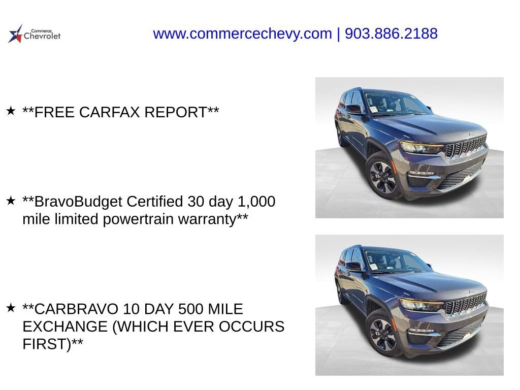 Discover the perfect balance of power and efficiency with the 2023 Jeep Grand Cherokee 4xe. This exceptional SUV combines the legendary capability of the Jeep brand with the advanced technology of a plug-in hybrid powertrain, delivering an unparalleled driving experience. **FREE CARFAX REPORT** **BravoBudget Certified 30 day 1,000 mile limited powertrain warranty** **CARBRAVO 10 DAY 500 MILE EXCHANGE (WHICH EVER OCCURS FIRST)** Baltic Gray Metallic Clearcoat GrayBeneath the striking exterior lies a 2.0L I4 DOHC engine paired with an 8-speed automatic transmission and 4-wheel drive, providing the perfect blend of power and efficiency. With the convenience of a plug-in hybrid system, you'll enjoy the benefits of electric driving for your daily commute, while the gasoline engine ensures you have the range and capability to tackle any adventure.Step inside the spacious and well-appointed cabin, where you'll find a wealth of premium features designed to enhance your driving experience. The Uconnect 5 Nav system with a 10.1 display, along with the 10-speaker audio system, will keep you connected and entertained. Dual-zone automatic climate control, a power liftgate, and a panoramic sunroof add to the luxurious ambiance.Safety is also a top priority, with advanced features like the ParkView Rear Back-Up Camera, Electronic Stability Control, and a suite of airbags to protect you and your passengers. The Jeep Grand Cherokee 4xe also boasts a host of driver-assist technologies, including Adaptive Cruise Control and Blind Spot Monitoring, to help you navigate the road with confidence.Whether you're seeking a capable off-road companion or a versatile family hauler, the 2023 Jeep Grand Cherokee 4xe is the perfect choice. With its impressive performance, cutting-edge technology, and uncompromising Jeep heritage, this SUV is sure to exceed your expectations.We invite you to experience the remarkable 2023 Jeep Grand Cherokee 4xe for yourself. Schedule a test drive today and discover the perfect balance of power, efficiency, and innovation that this exceptional vehicle has to offer.