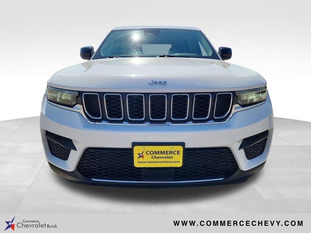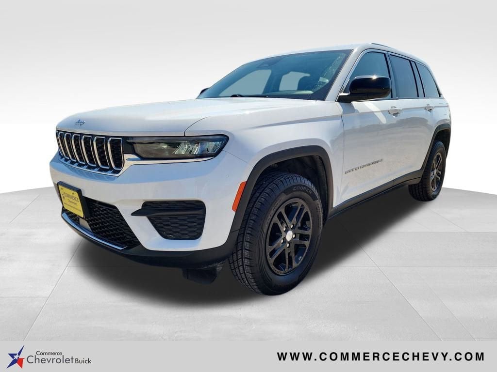 CARFAX One-Owner. We are a family owned and operated business. We look forward to serving all your automotive needs, sales, service, parts, and body shop. When it comes to your automotive needs, Commerce Chevrolet has you covered. Contact us today! 903-886-2188.This 2023 Jeep Grand Cherokee Laredo 3.6L V6 24V VVT 8-Speed Automatic 4WD in Bright White Clearcoat comes with the following features: **CARFAX REPORT**, **BravoBudget Certified 30 day 1,000 mile limited powertrain warranty**, and **CARBRAVO 10 DAY 500 MILE EXCHANGE (WHICH EVER OCCURS FIRST)** 4WD Quick Order Package 23A Laredo, 4WD, 3.45 Rear Axle Ratio, 4-Wheel Disc Brakes, 6 Speakers, ABS brakes, Air Conditioning, Alloy wheels, Anti-whiplash front head restraints, Automatic temperature control, Brake assist, Bumpers: body-color, Cloth Seats, Compass, Delay-off headlights, Driver door bin, Driver vanity mirror, Dual front impact airbags, Dual front side impact airbags, Electronic Stability Control, Emergency communication system, Four wheel independent suspension, Front anti-roll bar, Front Bucket Seats, Front Center Armrest w/Storage, Front dual zone A/C, Front License Plate Bracket, Front reading lights, Fully automatic headlights, Heated door mirrors, Illuminated entry, Knee airbag, Low tire pressure warning, Molded In Color Black/Gloss Black Roof Rails, Normal Duty Suspension, Occupant sensing airbag, Outside temperature display, Overhead airbag, Overhead console, Panic alarm, ParkView Rear Back-Up Camera, Passenger door bin, Passenger vanity mirror, Power door mirrors, Power driver seat, Power steering, Power windows, Radio data system, Radio: Uconnect 5 w/8.4 Display, Rear anti-roll bar, Rear reading lights, Rear window defroster, Rear window wiper, Remote keyless entry, Security system, Speed control, Speed-Sensitive Wipers, Split folding rear seat, Spoiler, Steering wheel mounted audio controls, Tachometer, Telescoping steering wheel, Tilt steering wheel, Traction control, Trip computer, Variably intermittent wipers, Voltmeter, and Wheels: 17 x 6.5 Fully Painted Aluminum.