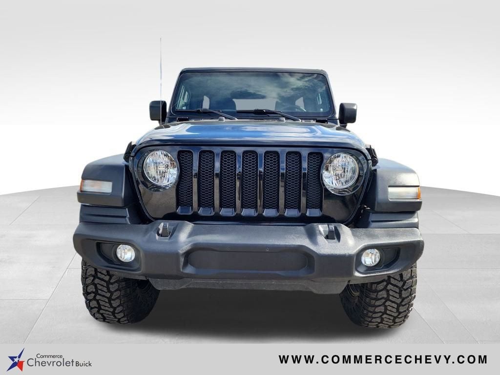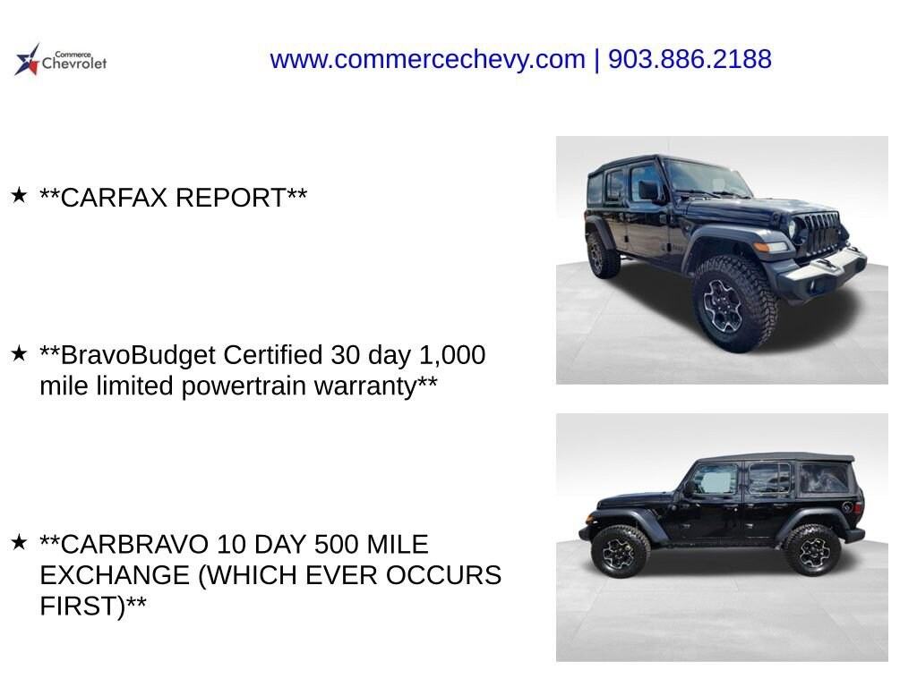 CARFAX One-Owner. We are a family owned and operated business. We look forward to serving all your automotive needs, sales, service, parts, and body shop. When it comes to your automotive needs, Commerce Chevrolet has you covered. Contact us today! 903-886-2188.This 2023 Jeep Wrangler Sport S 2.0L I4 DOHC 8-Speed Automatic 4WD in Black Clearcoat comes with the following features: Brand New 2.5 Lift Kit, 4 brand new shocks, 5 Brand New 295/70/17 Tires, Quick Order Package 22S Sport S (Automatic Headlamps, Deep Tint Sunscreen Windows, Front 1-Touch Down Power Windows, Power Heated Mirrors, Premium Wrapped Steering Wheel, Remote Keyless Entry, Security Alarm, Speed Sensitive Power Locks, Sport S, Sun Visors w/Illuminated Vanity Mirrors, and Wheels: 17 x 7.5 Tech Silver Aluminum), 3.45 Overall Top Gear Ratio, 4-Wheel Disc Brakes, 8 Speakers, ABS brakes, Air Conditioning, AM/FM radio, Apple CarPlay, Apple CarPlay/Android Auto, Aux Battery, Brake assist, Cloth Low-Back Bucket Seats, Compass, Delay-off headlights, Driver door bin, Driver vanity mirror, Dual front impact airbags, Dual front side impact airbags, Electronic Stability Control, Emergency communication system: SiriusXM Guardian, Engine Oil Cooler, Front anti-roll bar, Front Bucket Seats, Front Center Armrest w/Storage, Front fog lights, Front reading lights, Google Android Auto, GPS Antenna Input, Integrated Center Stack Radio, Integrated roll-over protection, Integrated Voice Command w/Bluetooth, Low tire pressure warning, Non-Lock Fuel Cap w/o Discriminator, Normal Duty Suspension, Occupant sensing airbag, Outside temperature display, ParkView Rear Back-Up Camera, Passenger door bin, Passenger vanity mirror, Power steering, Radio data system, Radio: Uconnect 4 w/7 Display, Rear anti-roll bar, Rear reading lights, Speed control, Split folding rear seat, Steering wheel mounted audio controls, Stop-Start Dual Battery System, Tachometer, Telescoping steering wheel, Tilt steering wheel, Traction control, Trip computer, USB Host Flip, Variably intermittent wipers, and Wheels: 17 x 7.5 Black Steel Styled.