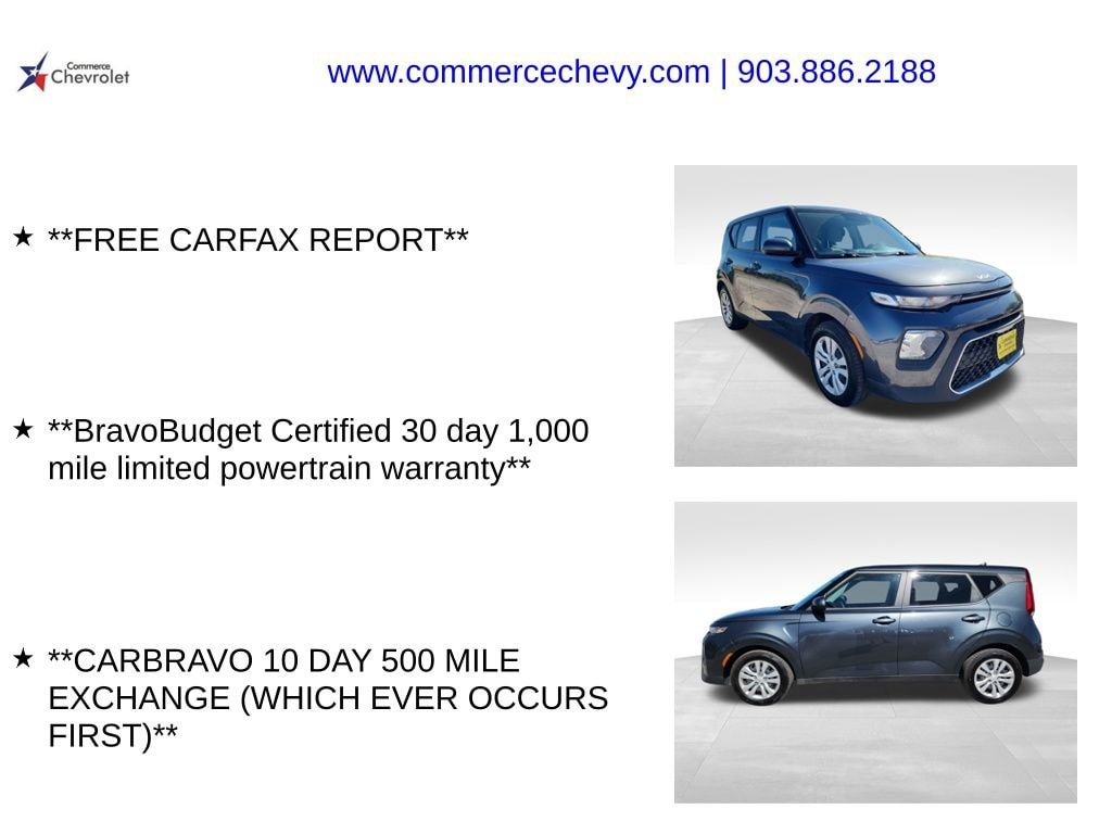 The 2022 Kia Soul LX is a versatile and practical compact SUV that offers an exceptional blend of style, efficiency, and convenience. With its sleek exterior design, spacious interior, and impressive array of features, this vehicle is an outstanding choice for those seeking a well-rounded and reliable daily driver.Backed by our BravoBudget Certified 30-day, 1,000-mile limited powertrain warranty and the CARBRAVO 10-day, 500-mile exchange policy, you can purchase this 2022 Kia Soul LX with confidence. Additionally, a complimentary CARFAX report is provided, ensuring complete transparency and peace of mind.This Soul LX boasts a 2.0L I4 DOHC engine paired with a CVT transmission, delivering an impressive 29 city/35 highway MPG. The exterior is finished in a sleek Gray color, complementing the vehicle's modern and sophisticated aesthetic.Key features of this 2022 Kia Soul LX include:- BravoBudget Certified 30-day, 1,000-mile limited powertrain warranty- CARBRAVO 10-day, 500-mile exchange policy- Free CARFAX report- Apple CarPlay & Android Auto- Rear parking camera- Steering wheel-mounted audio controls- Traction control- Dual front impact and side airbags- Front bucket seats with split-folding rear seatThe Kia Soul LX also boasts a host of convenient and practical features, such as power windows, remote keyless entry, and a rear window wiper, making it an ideal choice for your everyday driving needs.Whether you're commuting to work, running errands, or embarking on weekend adventures, the 2022 Kia Soul LX is a versatile and reliable companion that will exceed your expectations. Visit our showroom today and experience the exceptional value and quality that this compact SUV has to offer.